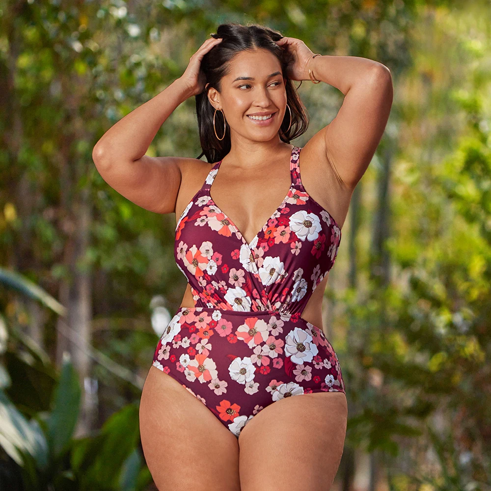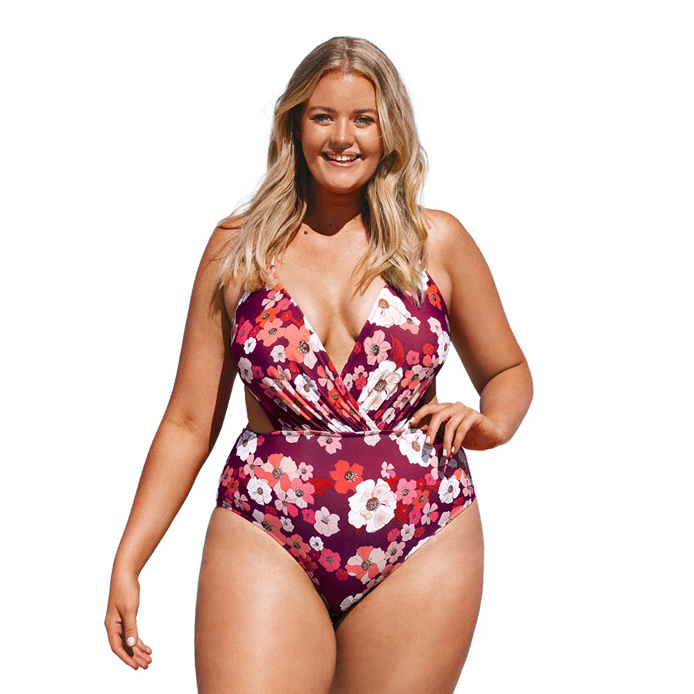 Покажите свои изгибы с нашим цветочным вырезом Оливии размера плюс цельный купальник. Особенности выреза и завязывания деталей для сексуальных вибраций. Ремешки крест-накрест на спине для дополнительной поддержки, в то время как выглядит мило.