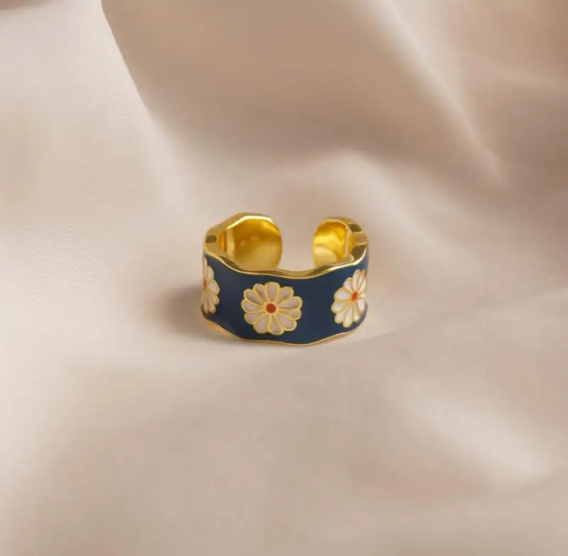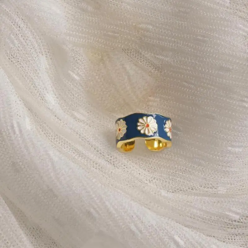 Французское пасторальное женское элегантное винтажное эмалированное кольцо с синей глазурью Маргаритки