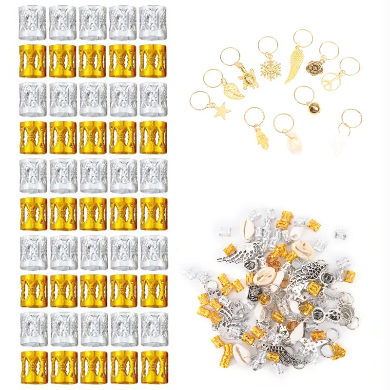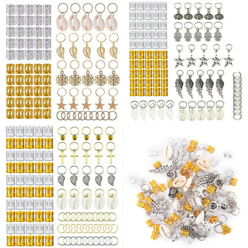 Посылка включает в себя:100 шт./компл.:25 x серебряные бусины дреды25 x золотые дреды бусины30 круглых колец5 x кольца ракушки5 х колец для листьев5 x кольца с колокольчикамиКольцо с крестами-5 шт.