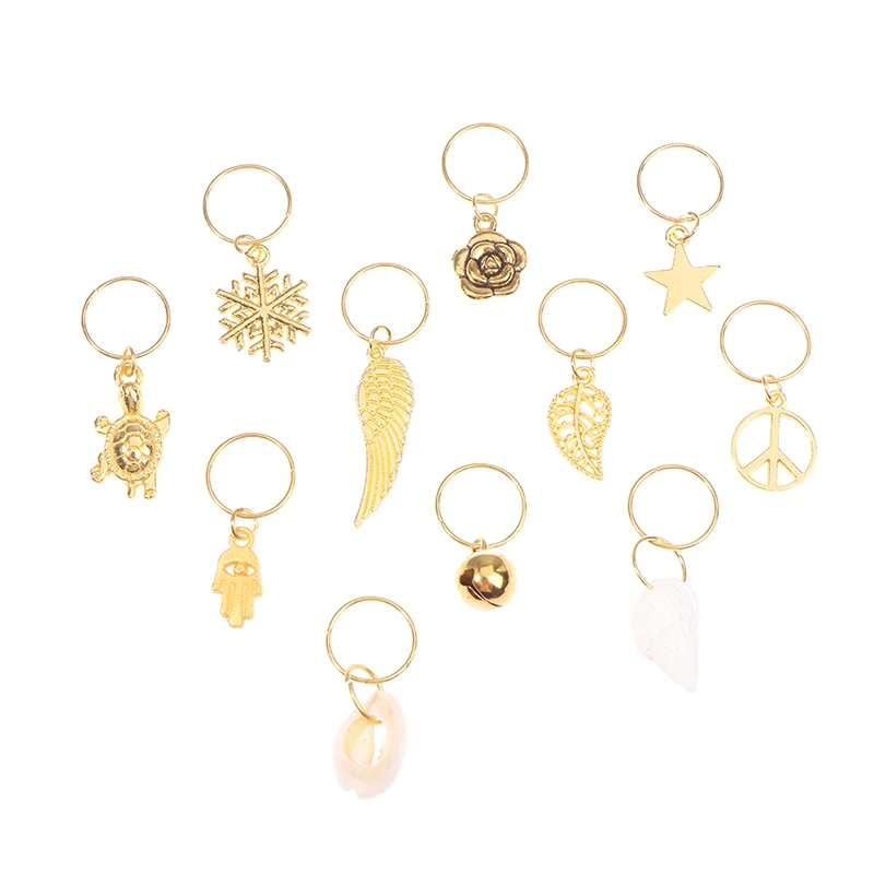 20 штук DIY заколка для волос кольцо Подвески Украшения4 различных формы: ракушки, колокольчики, листья, кресты.Инструкция: заплетите или закрутите волосы в желаемом стиле, закрутите концы, раскройте по бокам Кольца для волос; Их можно легко сделать пальцами (без клещей); кольца со вставками в нужном месте на вашей Косе, закройте зажимы пальцами.
