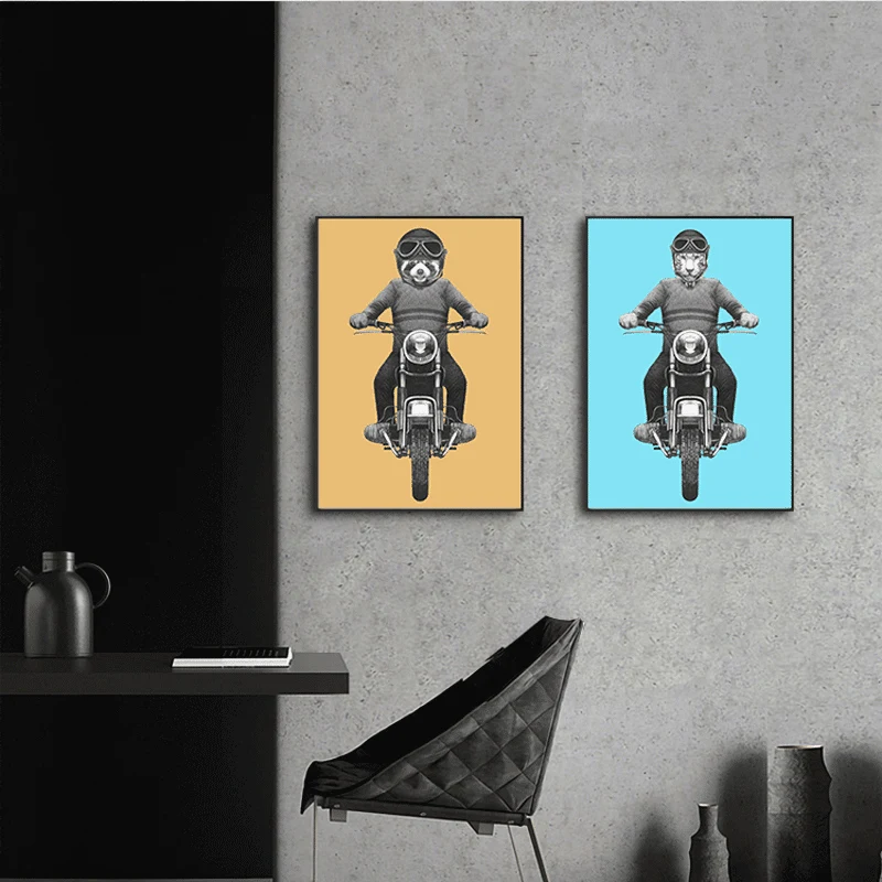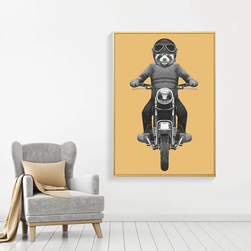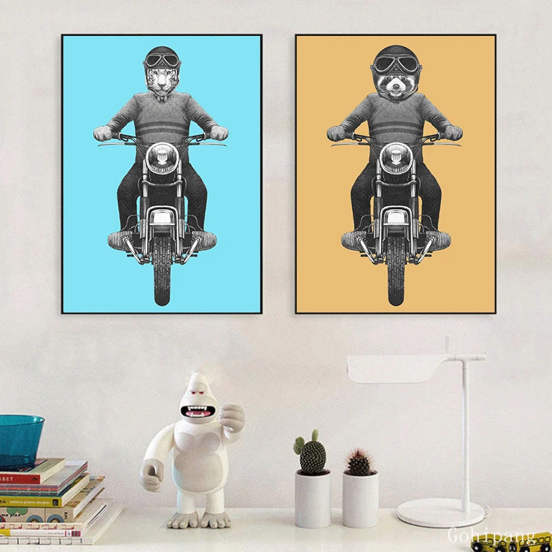 Картина на холсте с изображением симпатичного крутого тигра и енота на мотоцикле, постер для детской комнаты, домашний декор, Настенная картина, бесплатная доставка