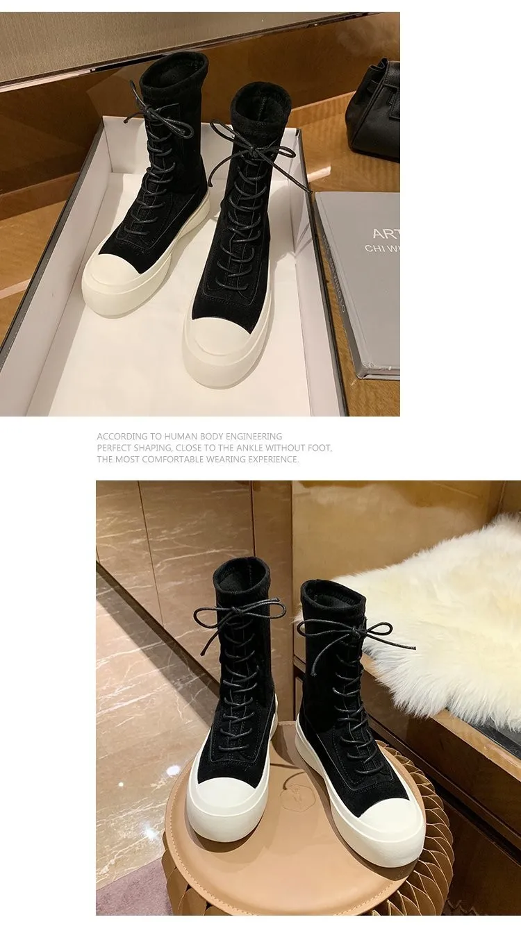 Зимние плюшевые сапоги до колена, женские черные кожаные боевые сап...