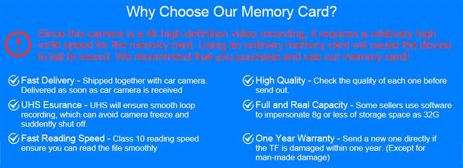 Поскольку эта камера является видеозаписью высокой четкости 4k, она требует относительно высокой скорости записи для карты памяти. Использование обычной карты памяти приведет к тому, что машина не сможет записывать данные. Мы рекомендуем вам приобрести и использовать нашу карту памяти