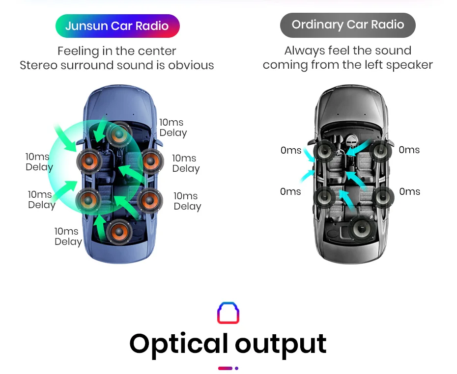> Эта технология может регулировать объемный звук вверх и вниз, так что это значительно снижает уровень шума и делает эффект преобразования звука максимальным, чтобы вы могли наслаждаться высококачественной музыкой в вашем автомобиле.