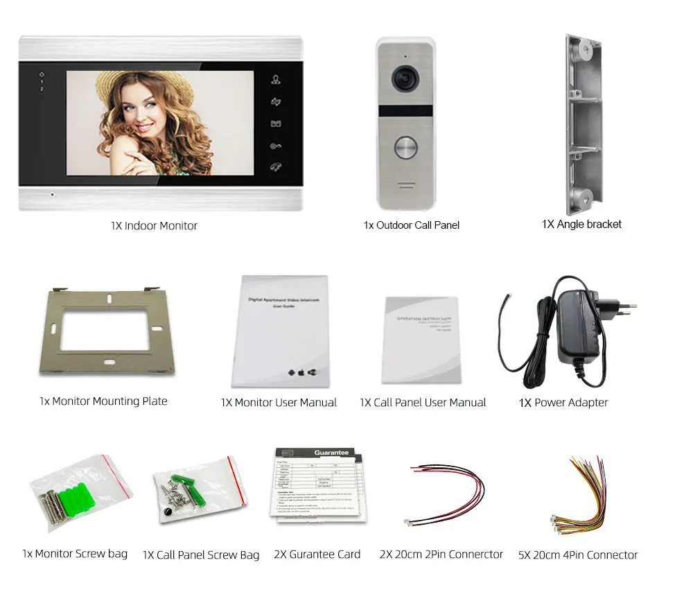 Поддержка монитора для подключения 6 внутренних мониторов, 2 замков, 2 панели вызова и 2 камеры наблюдения в основном, этот товар является бесплатным и доступен для двусторонней связи. Он поддерживает связь между внутренним монитором и наружной камерой, но также поддерживает связь между монитором и монитором. Вы не всегда будете спускаться вниз, открыв дверь после установки многократного домофона, даже если никто не прижмет дверной звонок, вы все равно можете смотреть изображения, сделанные дверным звонком в мониторе
