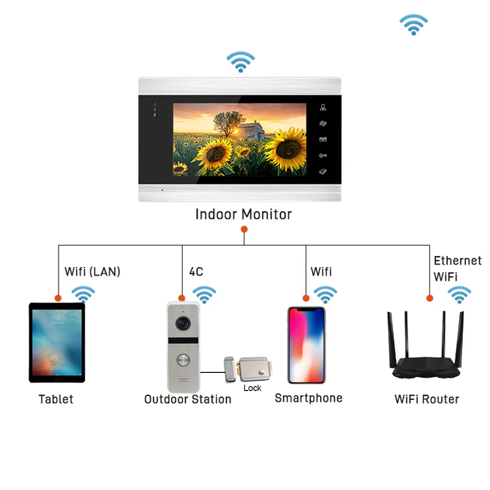 Обратите внимание, что система видеодомофона Wi-Fi не означает, что вам не нужен провод. Монитор поддерживает беспроводное подключение к Wi-Fi, но внутренний монитор и дверной звонок проводной, что гарантирует питание, видео работает стабильно, и вы можете увеличить расстояние