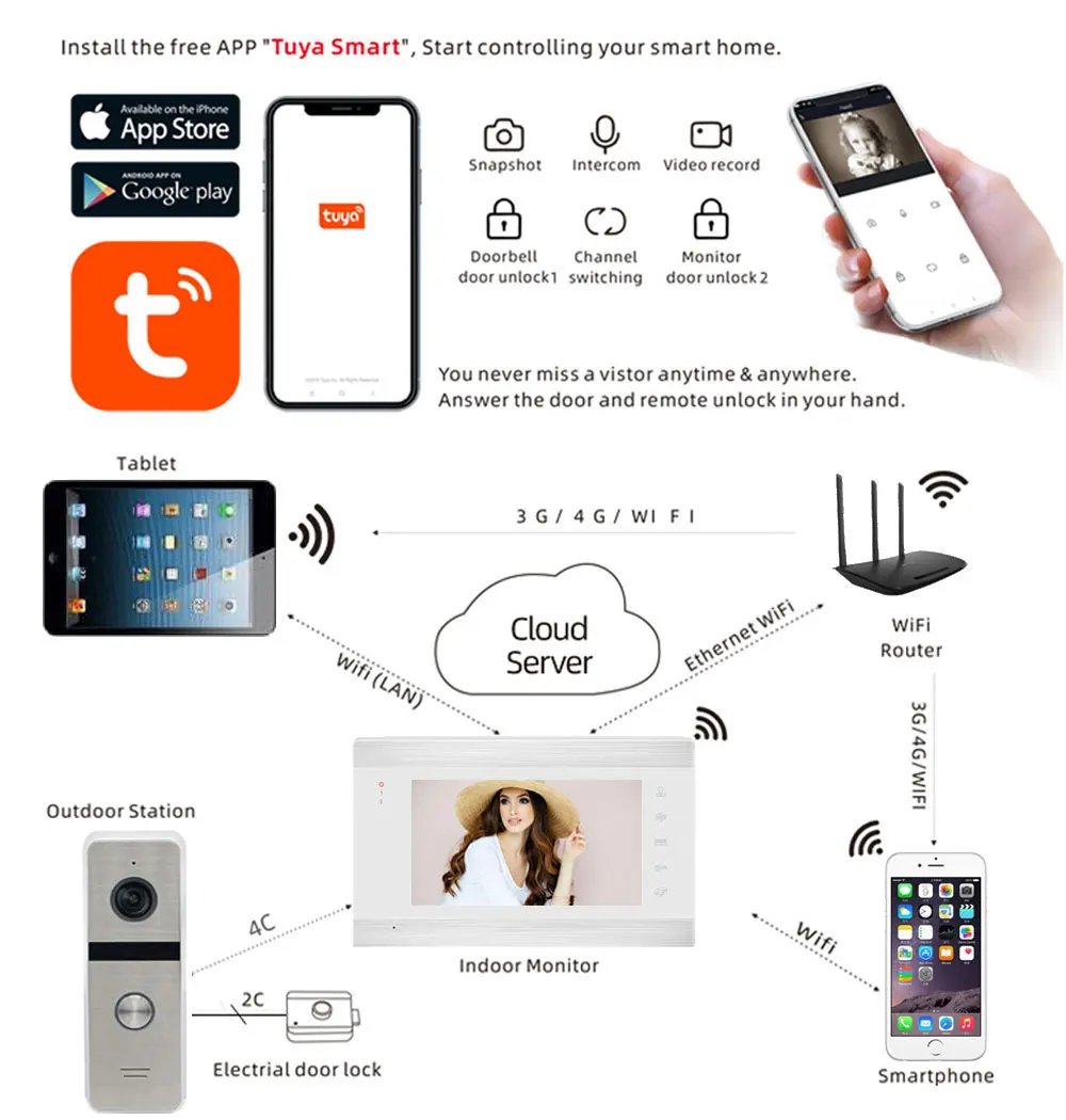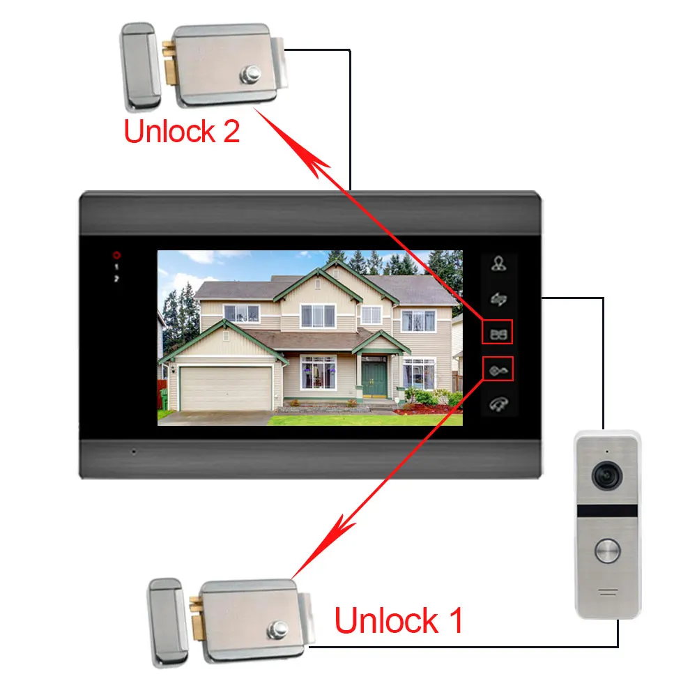 Этот набор поддерживает подключение 2 электронных замка в основном, после подключения электронного замка, вы можете использовать приложение или монитор, чтобы открыть дверь. Когда вы находитесь наверху, в саду или даже если вы не дома, вы можете дистанционно разблокировать дверь электрического замка для своих друзей и семьи через бесплатное приложение