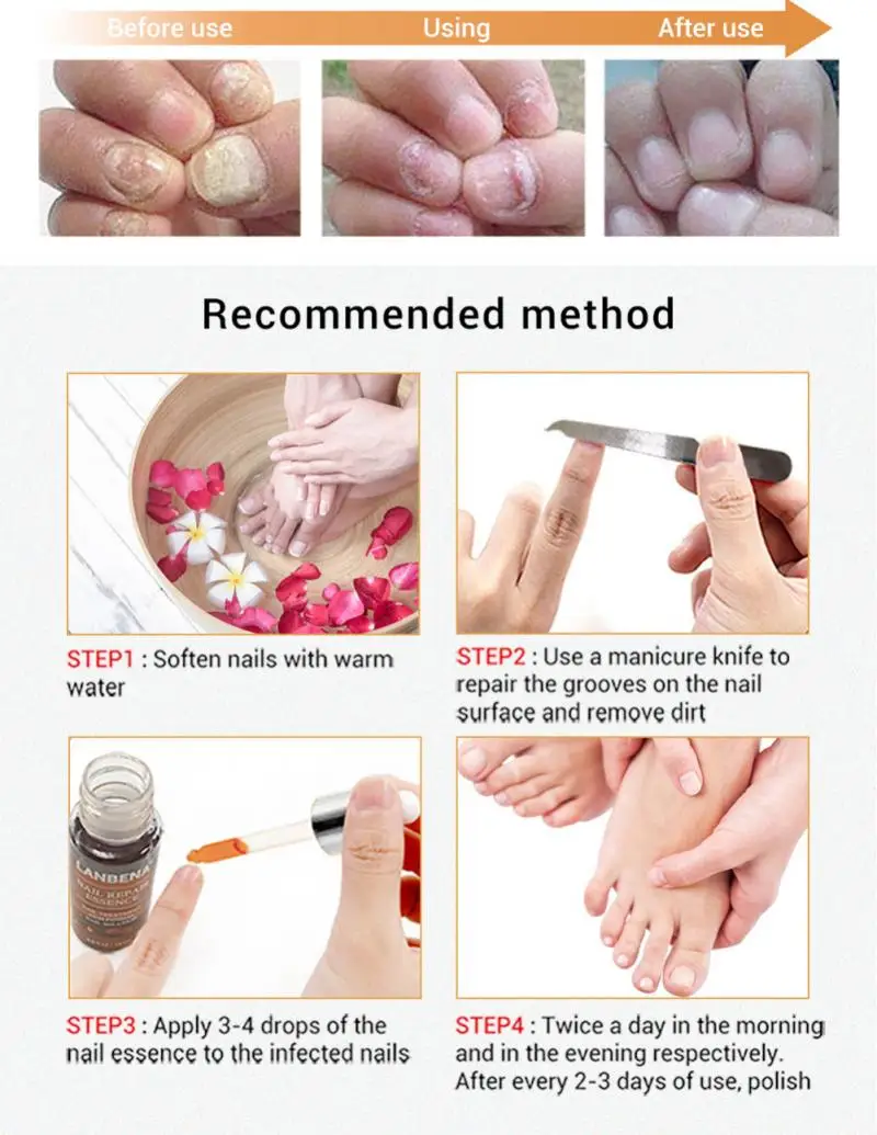 1. Смягчить ногти теплой водой.2. Используйте маникюрный ножик для ремонта канавок на поверхности ногтей и удаления грязи.3. Нанесите 3-4 капли эссенции ногтя на инфицированные ногти.4. Два раза в день утром и вечером соответственно. Через каждые 2-3 дня использования полируйте поверхность ногтей, а затем Продолжайте использовать.