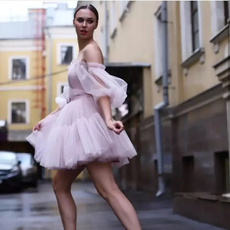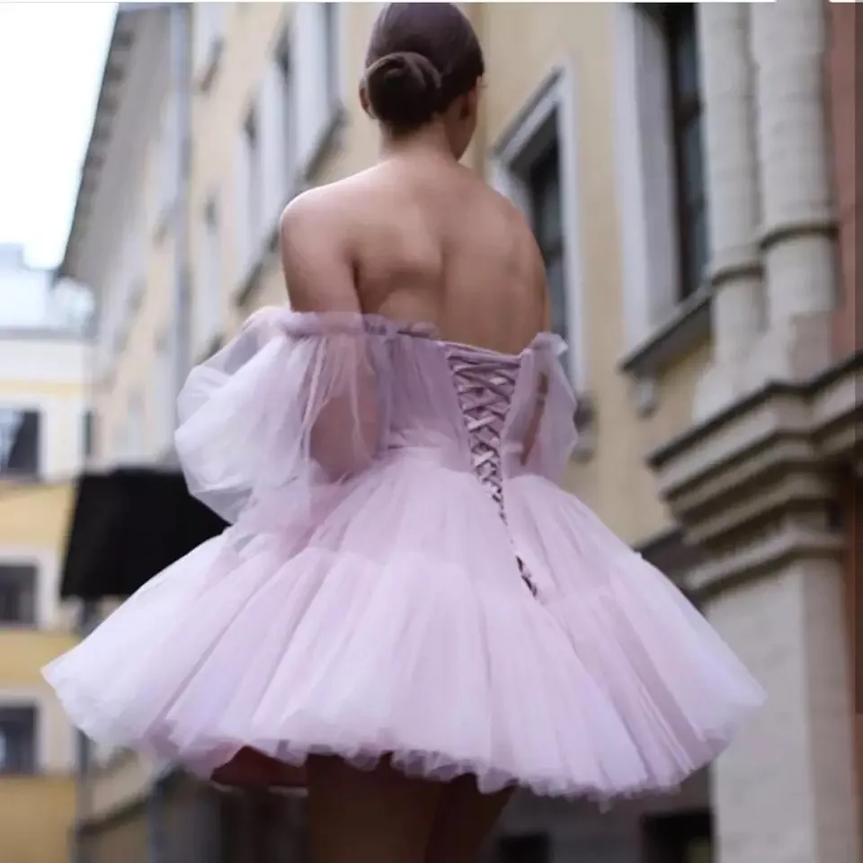 Сладкий светильник розовый Бальные платья 2021 Милая пуховка рукав в складку длиной выше колена Мини Вечерние Платье на выпускной, платье из фатина с открытыми плечами