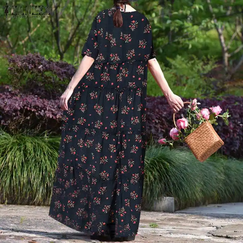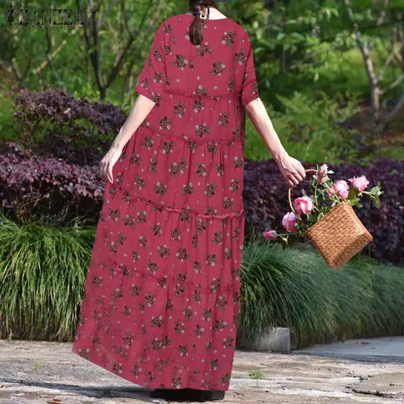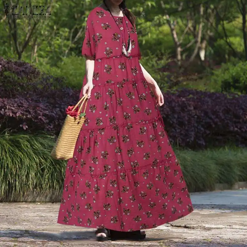 Платье ZANZEA женское длинное с цветочным принтом, винтажное свободное богемное Платье макси с круглым вырезом и коротким рукавом, с оборками, лето