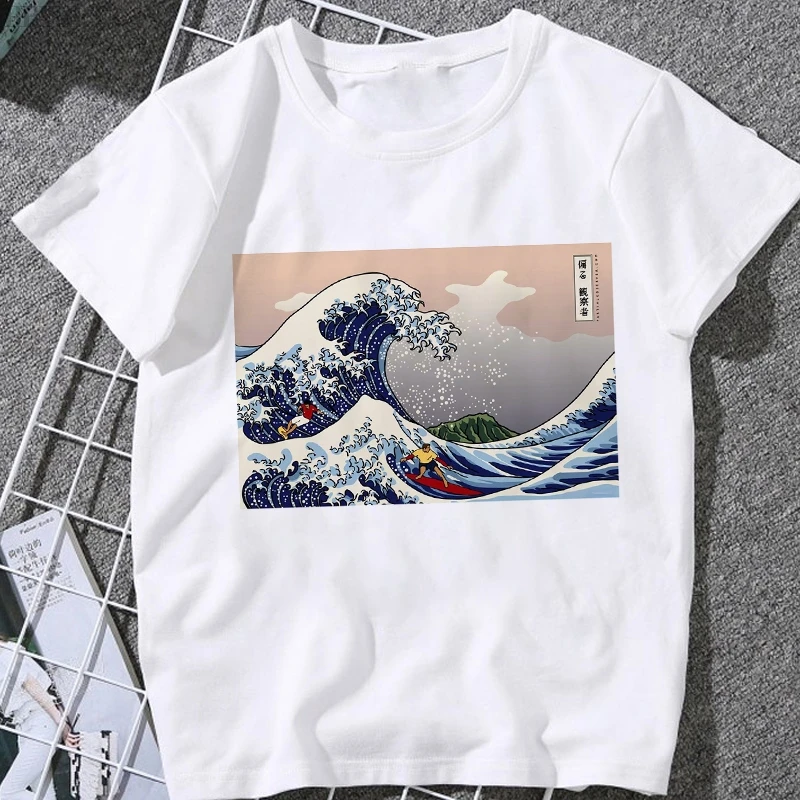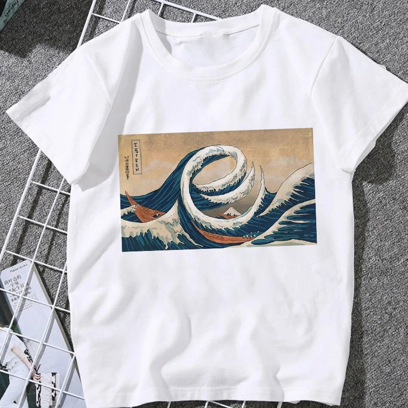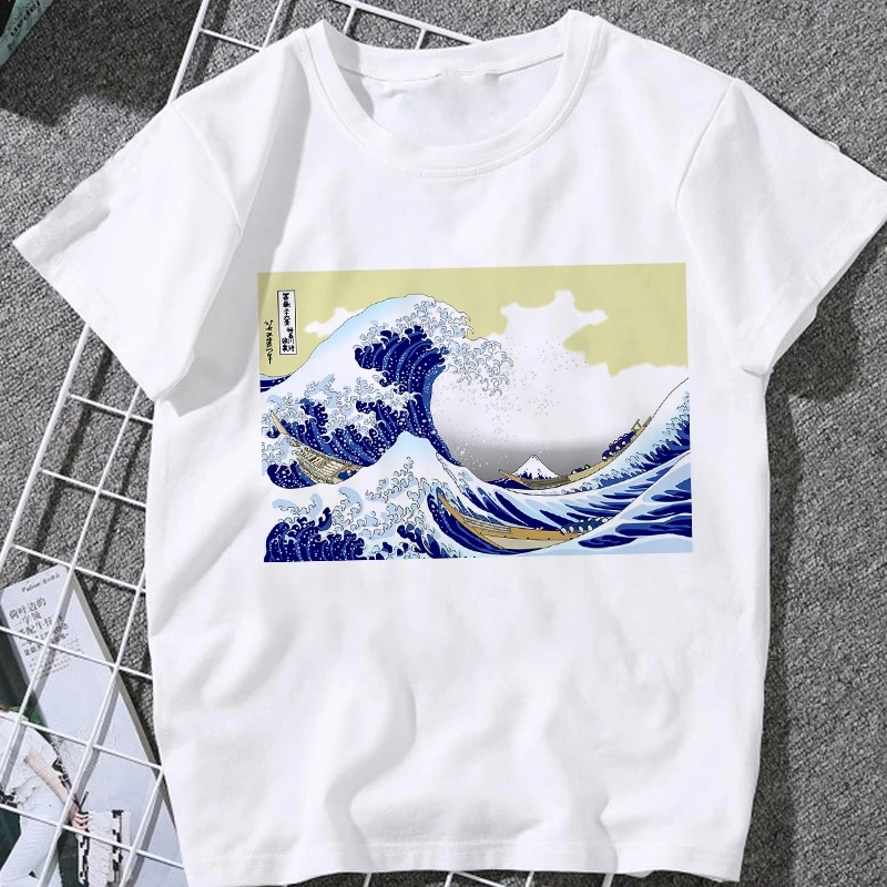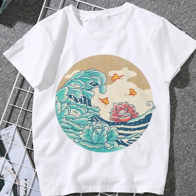 Футболка женская Harajuku, с принтом китов и волн, в японском стиле, летняя, с коротким рукавом
