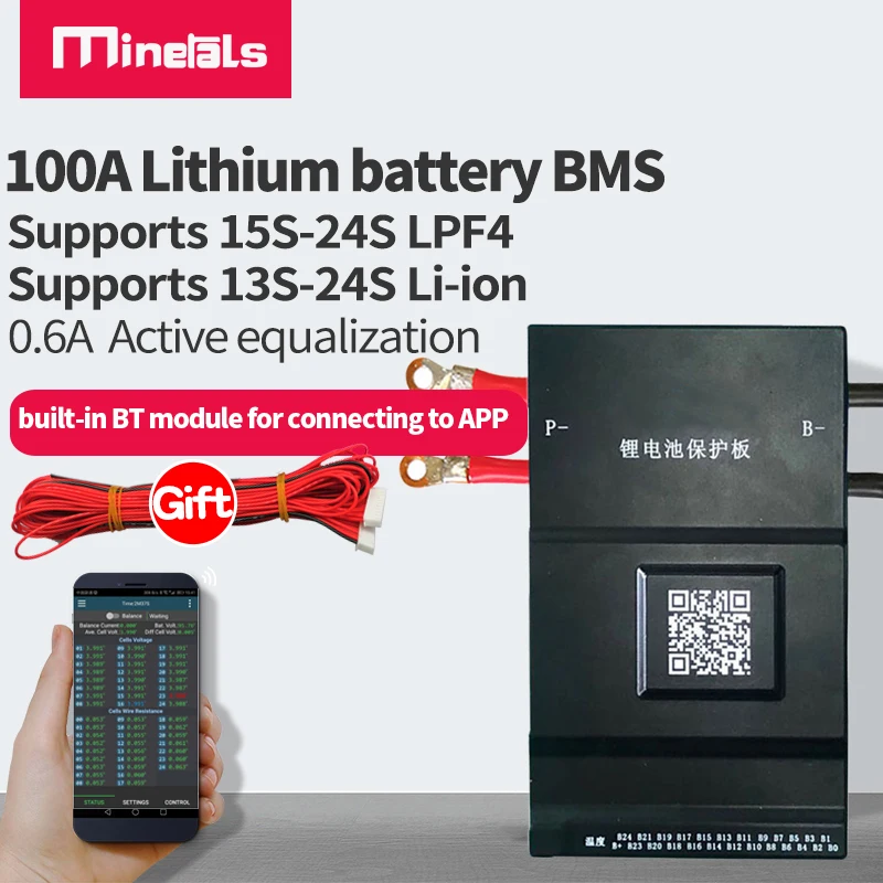 Это активный BMS, он поддерживает 13S-24S Li ion и 15S-24S LiFePo4Постоянный ток АТакже имеет активный ток выравнивания 0,6 АОн может настроить напряжение выравнивания и параметры защиты от заряда и разряда через приложениеМожет отображать напряжение батареи одной серииПосле подключения BMS, пожалуйста, используйте источник питания, который на 5 в больше, чем напряжение батареи, чтобы активировать его