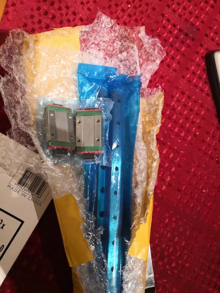 Заказал направляющие для станка на 3 оси. Доставка заняла почти 2 месяца. Посылка отслеживалась, большую часть времени посылка шла у нас по России, видимо, лежала где-то на таможне. Упаковано хорошо в картонную коробку. По одному блоку надето на рельсы, остальные лежат в отдельном пакете. Продавец положил небольшой пакетик с дополнительными шариками.