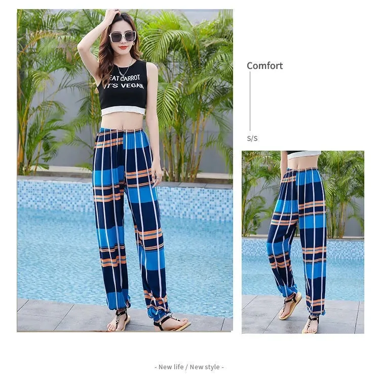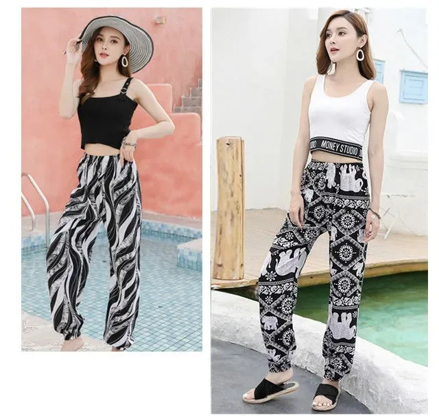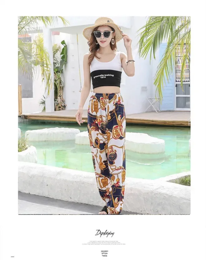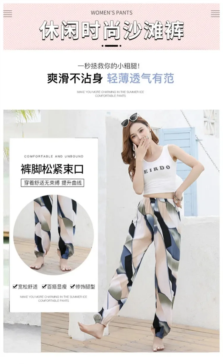 Женские хлопковые Шелковые летние пляжные свободные брюки с цветочным принтом, модные повседневные эластичные дышащие мягкие длинные брюки с высокой талией для девочек