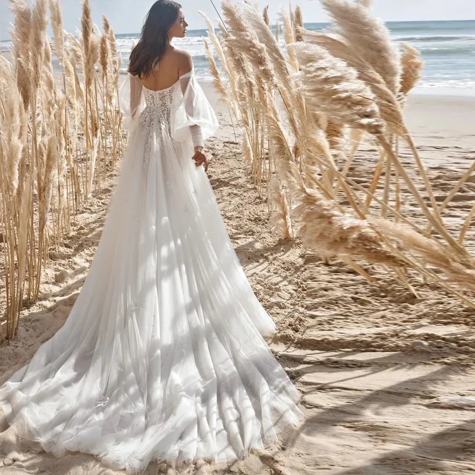 Тюлевые Свадебные платья с открытыми плечами, модель 2021 года, трапециевидные пышные рукава-фонарики, крест-накрест, стиль сердечек, искусственная кожа, со шлейфом