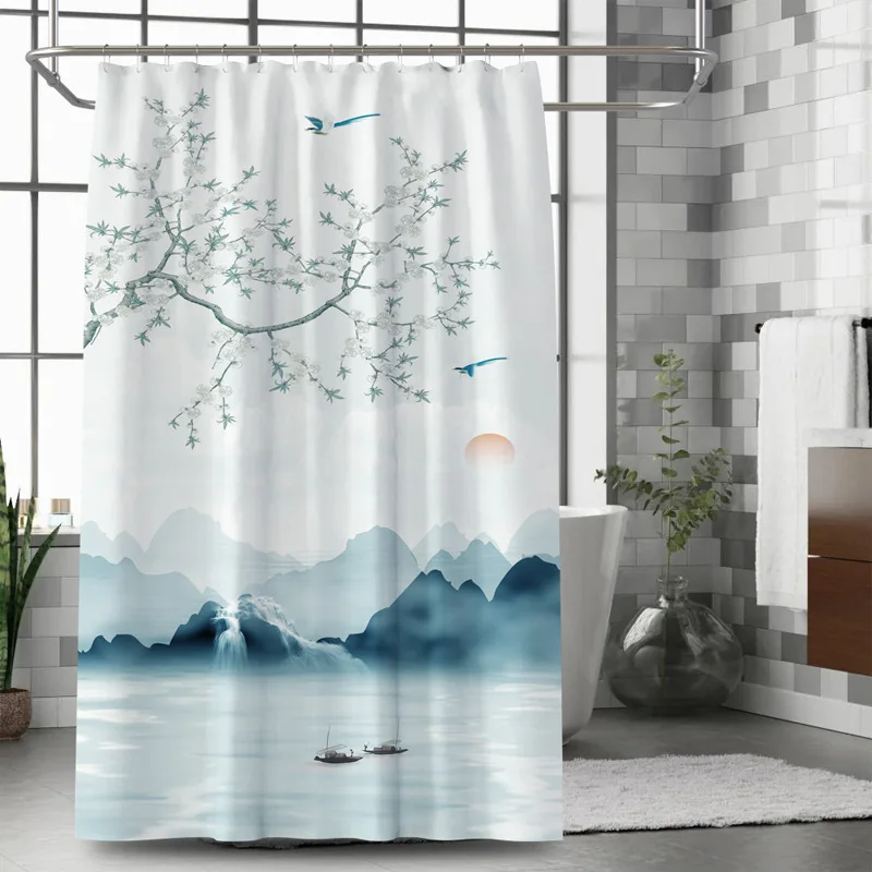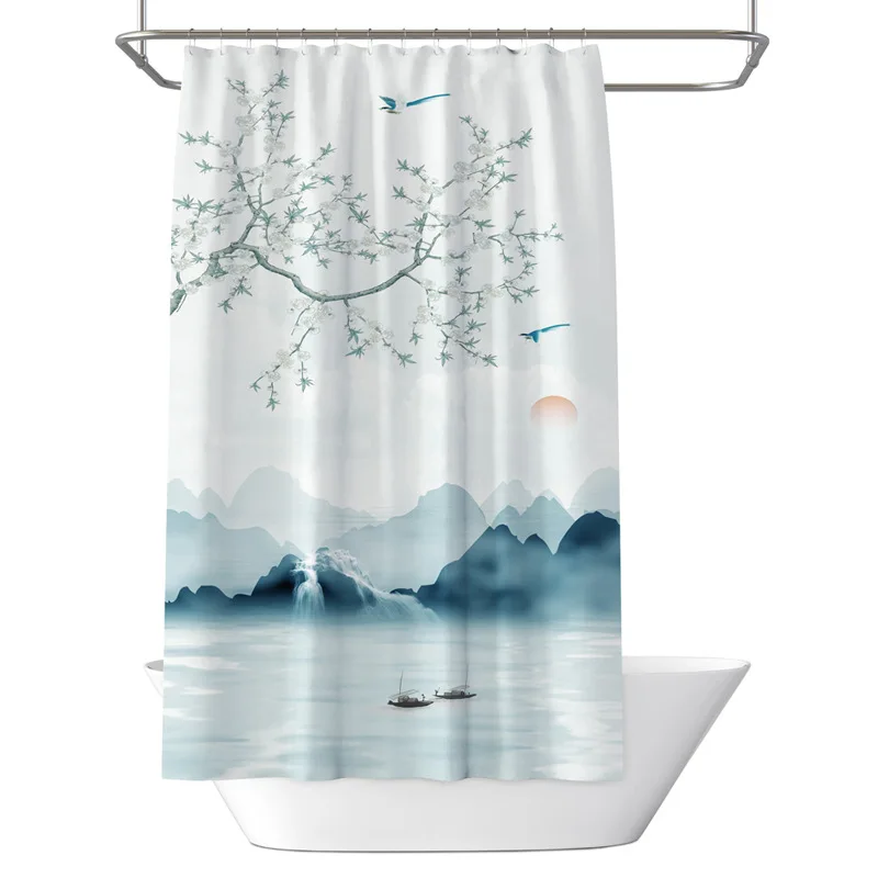 Занавеска для душа из полиэстера, водонепроницаемая, в китайском стиле, с изображением пейзажа, с цифровой печатью, для ванной