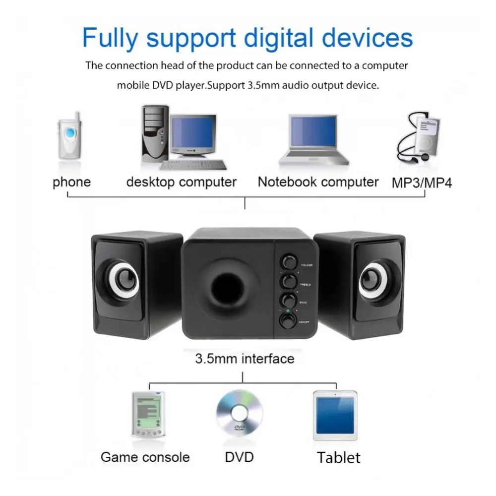 USB 2,1 объемный бас стерео портативный компьютерный динамик Мультимедиа bluetooth динамик s с сабвуфером для настольного ПК компьютера Характеристики:Питание от USB напрямую, простое подключение.Полночастотный Вибрационный громкоговоритель большого диаметра, глубокий бас, богатый средний и четкий тройник.Задний бас-труба, бас толстый, чтобы принести вам высокое качество басов.Выключатель питания, прост в использовании.Отлично работает, края отполированы, гладкая обработка.Высокая магнитная колонка, дает вам различный опыт прослушивания.Можно подключить ПК, ноутбук, мобильный телефон, MP3, MP4, DVD. Название товара: колонкиМатериал: пластикВыходная мощность: 3 ВтТип соединения: 3,5 мм аудио разъемИсточник питания: USB/DC 5 ВСтепень разделения: >= 40 дБОтношение сигнал-шум: >= 80 дБЧастота: 25 Гц ~ 20 кГцКанал: 2,1Характеристики: портативный, компактный размер, сабвуферОсновной динамик: 127 мм x 117 мм x 96 мм/5,00 "x 4,61" x 3,78 "(прибл.)Поддинамик: 96 мм x 77 мм x 61 мм/3,78 "x 3,03" x 2,40 "(прибл.) Примечания:Благодаря светильник и экрана Цвет Товара может быть s светильник ly отличается из-за характеристик монитора компьютера.Возможны незначительные отклонения в размерах из-за различных измерений вручную. Посылка включает в себя:1 х основной динамик2 подколонки