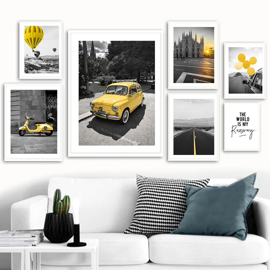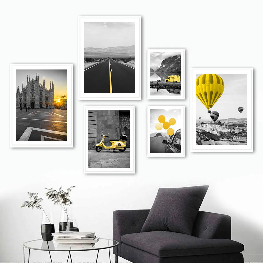 Черный пейзаж, желтый мото горячий шар, автомобиль, настенная Картина на холсте, скандинавские плакаты и принты, настенные картины для декора гостиной