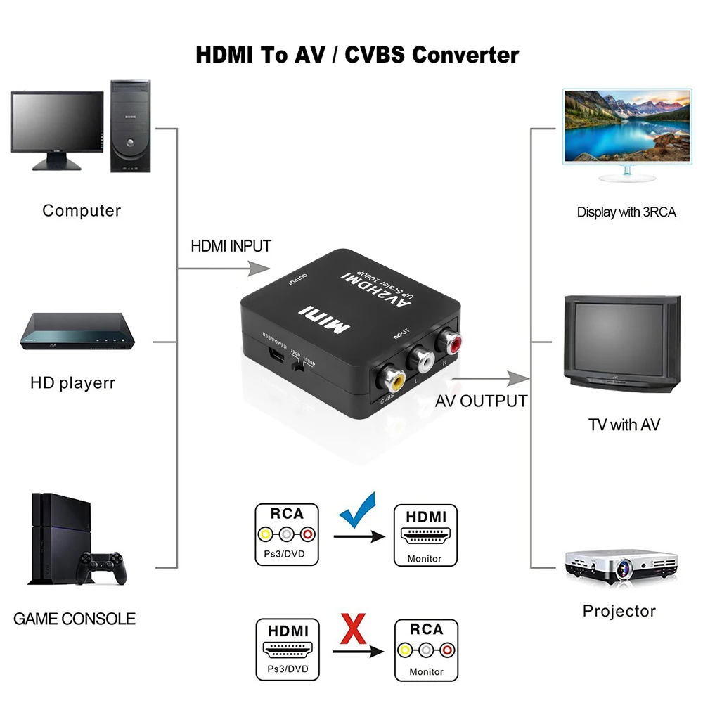Этот мини AV/CVBS в HDMI конвертер является универсальным преобразователем для аналогового композитного входа в HDMI 1080p (60 Гц) выход