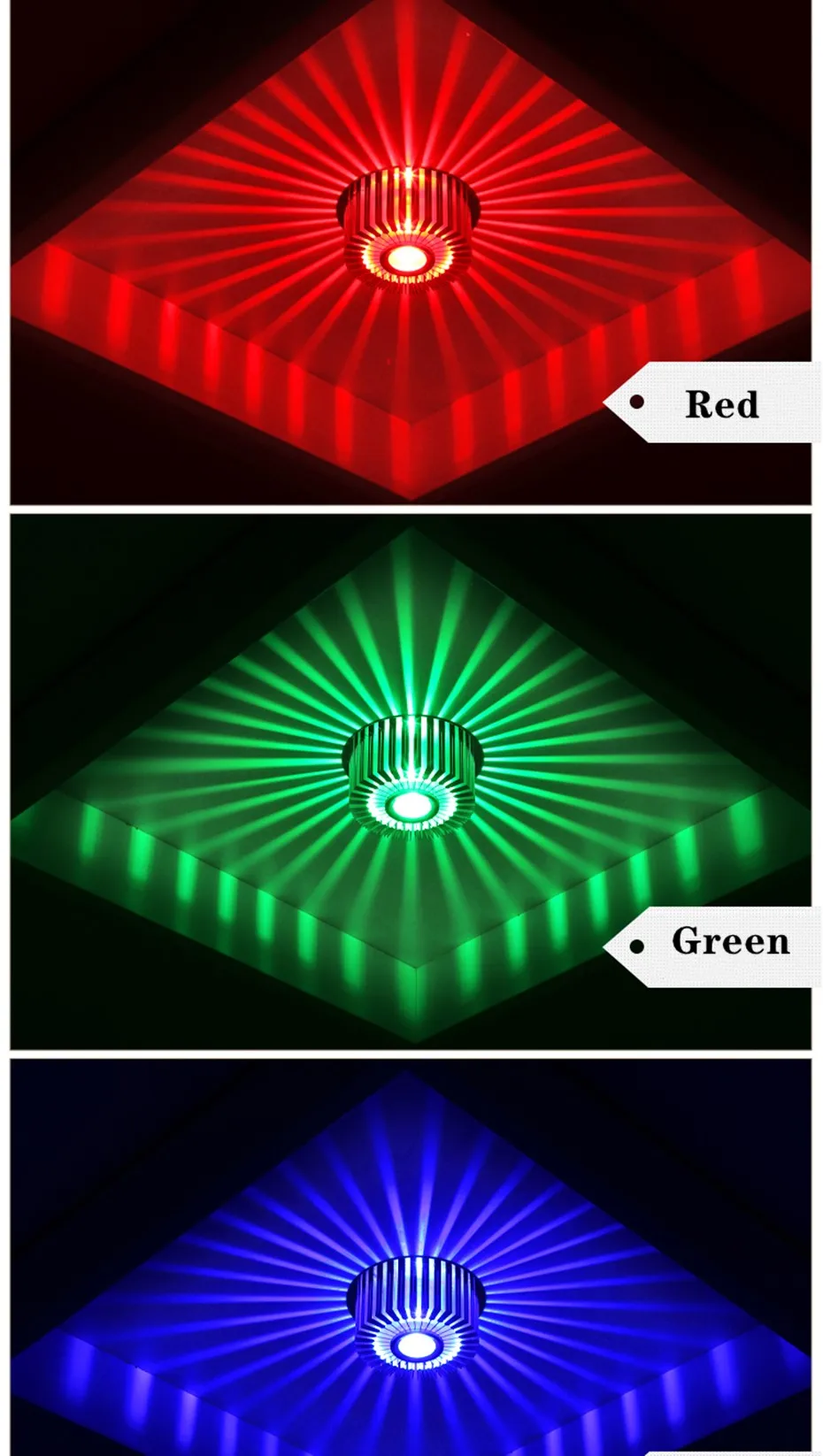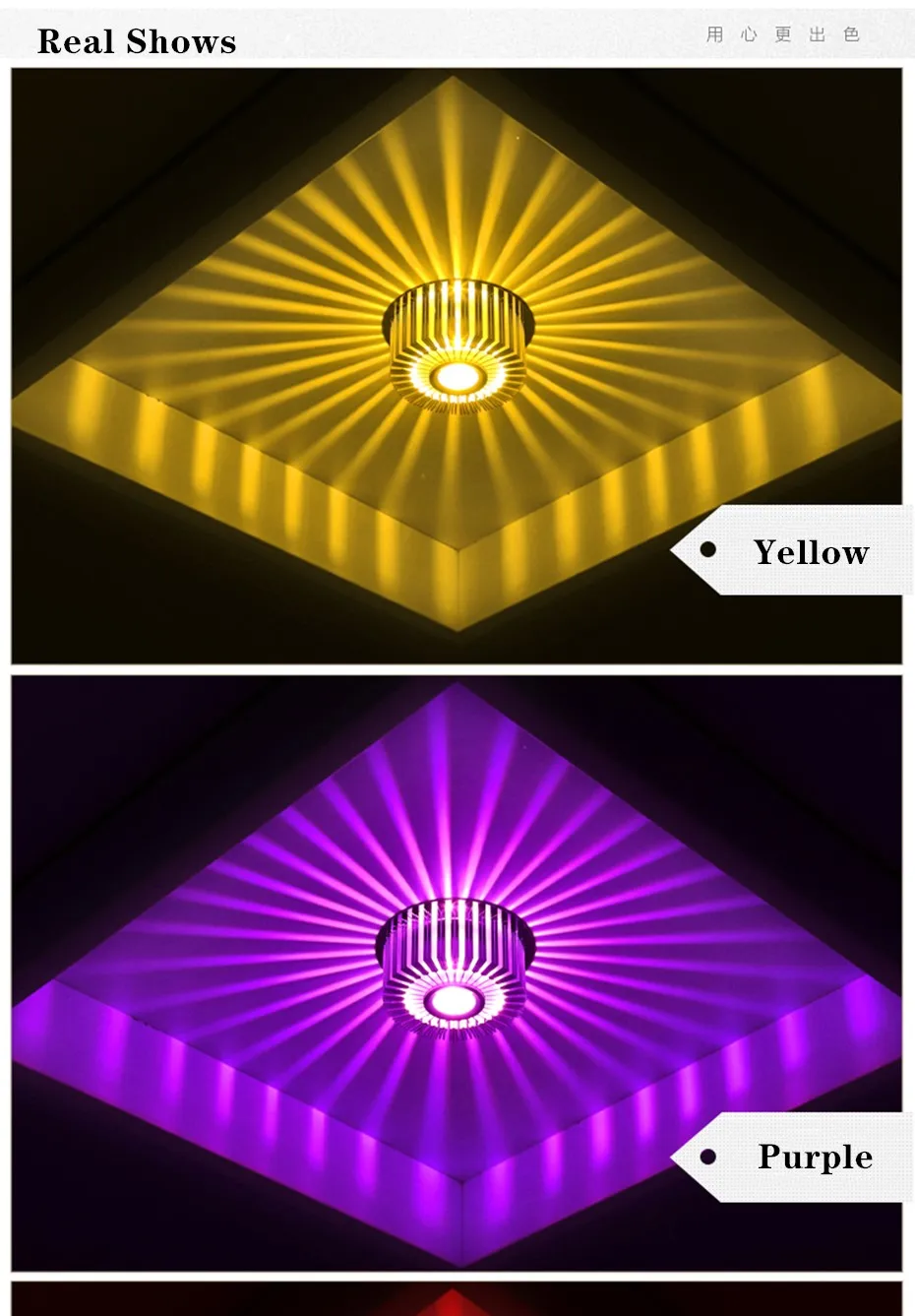 1 материал: алюминий2. Тип: настенный светильник KTV3. Источник светильник: чип Epistar4, Мощность: 3 Вт5, напряжение: 85-265 в6. Выходная яркость: 90-100 лм/Вт7. Цвет корпуса: серебристый8, Размер: настенный Размер: 88 × 60 ммВстроенный Размер: 88 × 30 мм9. Цвет света: синий/зеленый/красный/желтый/фиолетовый/теплый белый/холодныйБелый
