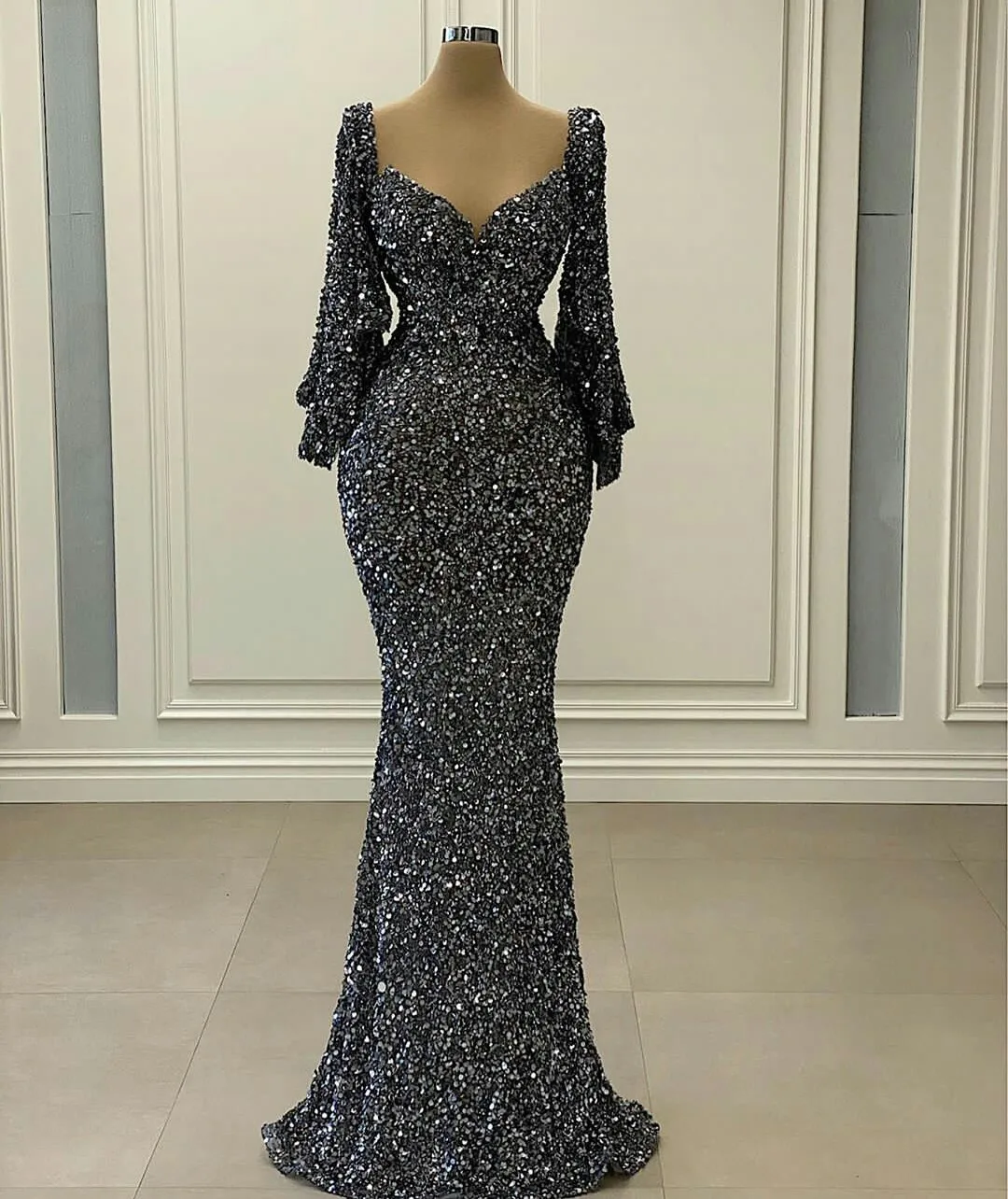 Женское вечернее платье с юбкой годе, черное платье с блестками и V-образным вырезом, с расклешенными рукавами, элегантное платье для выпускного вечера, 2022
