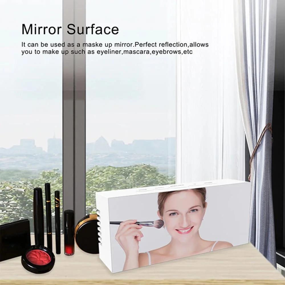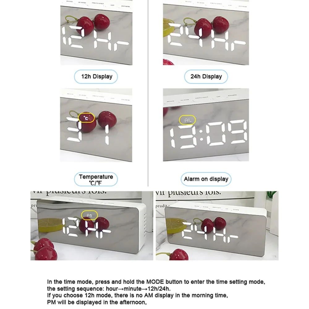 Электронные настольные часы с зеркальным дисплеем включают в себя - индикатор температуры, функцию будильника и показывает дату. Светодиодный LED циферблат подсвечивается зеленым цветом.Особенности часов:- Часы могут автоматически переключаться на тусклый режим в ночное время.- Отображают не только время, но и температуру в помещении.- Питание часов от кабеля USB (5 вольт) или от трех батареек типа ААА (при работе от батареек - дисплей выключается через 10 сек., при питании кабеля USB - часы светятся постоянно).- Можно настроить два варианта яркости свечения циферблата (светлый, тусклый).- Формат времени отображается в двух вариантах 12/24.- В часах есть функция будильника.- Светодиодный экран можно использовать как зеркало.Характеристики:- Дисплей часов: зеркальный.- Кнопки управления: на верхней части часов.- Вес часов: 90г.Комплектация:- Часы.- Кабель USB без блока питания.- Инструкция на английском языке.
