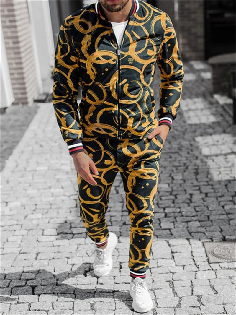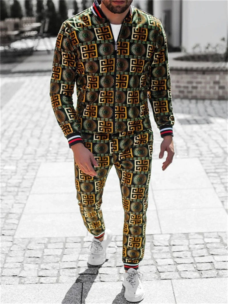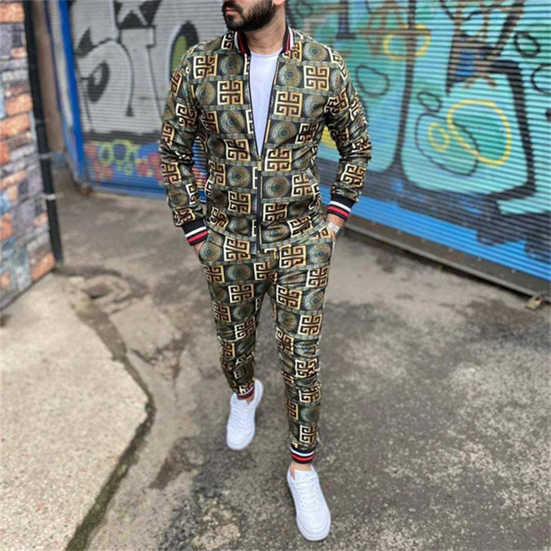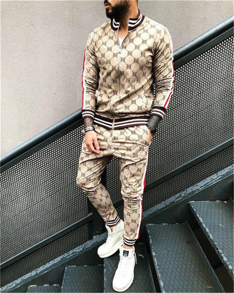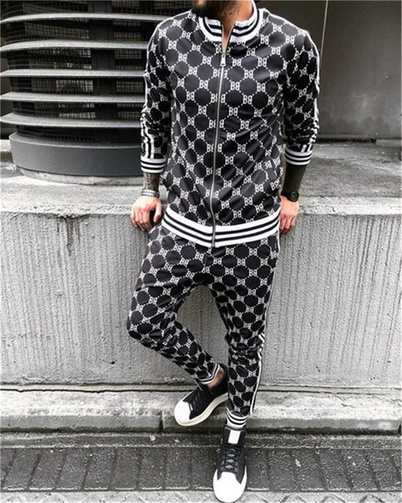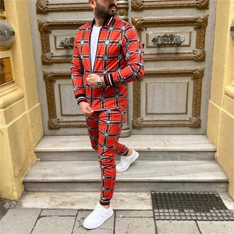 Мужской Клетчатый спортивный костюм с объемным рисунком, мужской комплект из куртки и спортивного костюма для фитнеса, модный мужской комплект из 2 предметов на молнии, спортивный костюм для мужчин