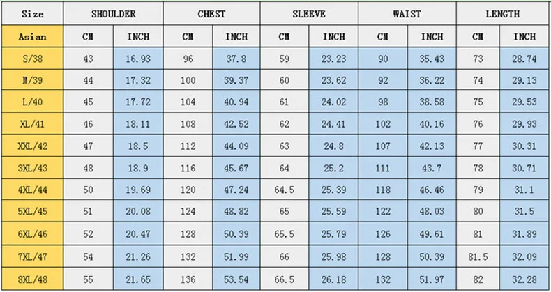 2) Как правило, размер рубашки должен быть больше вашего размера. Вы можете проверить свою обычную рубашку. Если обхват груди 100 см, мы предлагаем вам выбрать рубашку с 104 см или 108 см.