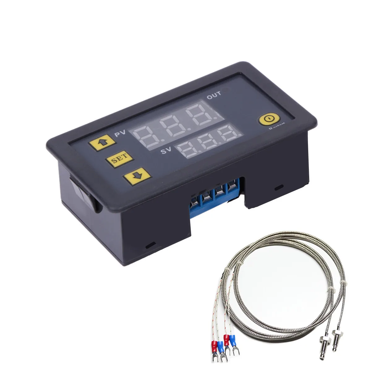 Диапазон контроля температуры: -60C-500CТочность измерения температуры: 1сРазрешение: 0.1CЧастота обновления: 0.5SНапряжение питания: переменный ток 220V/DC 5V/12V/24V выходное: 10A релеРазмер отверстия: 74 мм X 39 ммПеред использованием, сначала поймите функцию термостата типа K. Изделие имеет в общей сложности четыре кнопки, кнопка плюс, кнопка минус, набор (кнопка настройки), кнопка сброса. Есть два набора цифровых трубок, показывающих фактическую температуру и заданную температуру соответственно. Все параметры автоматически запоминаются после 5 секунд настройки.Использование в эксплуатации:Красная цифровая трубка: фактическая температура,Синяя цифровая трубка: установите температуруКнопка плюс: Увеличьте заданную температуру.Кнопка минус: снижение температуры настройки.ВосстановлениеЗаводские настройки: Нажмите и удерживайте кнопку плюс для более чем5s в то же время, система восстановит исходные данные настроек.Набор кнопок (набор):1.Короткое нажатие, установите температуру, чтобы добавить 50 C каждый раз, пользовательМожно быстро нажать кнопку SET, чтобы быстро установить рядом с предустановкойЗначение температуры, а затем настроиться на заданную температуруНажмите на кнопку.2. Нажмите и удерживайте набор, чтобы ввести параметры настройки. Существует несколько параметров P00 ~ P05 для установки пользователем. После входа в интерфейс параметров нажмите set в ближайшее время, чтобы переключить P00 ~ P05 подСоответствующие параметры, соответствующие данные добавляются илиВычитается нажатием кнопки, и автоматические данные памятиВозвращен к интерфейсу дисплея после того, как система завершена в течение 10Секунд.