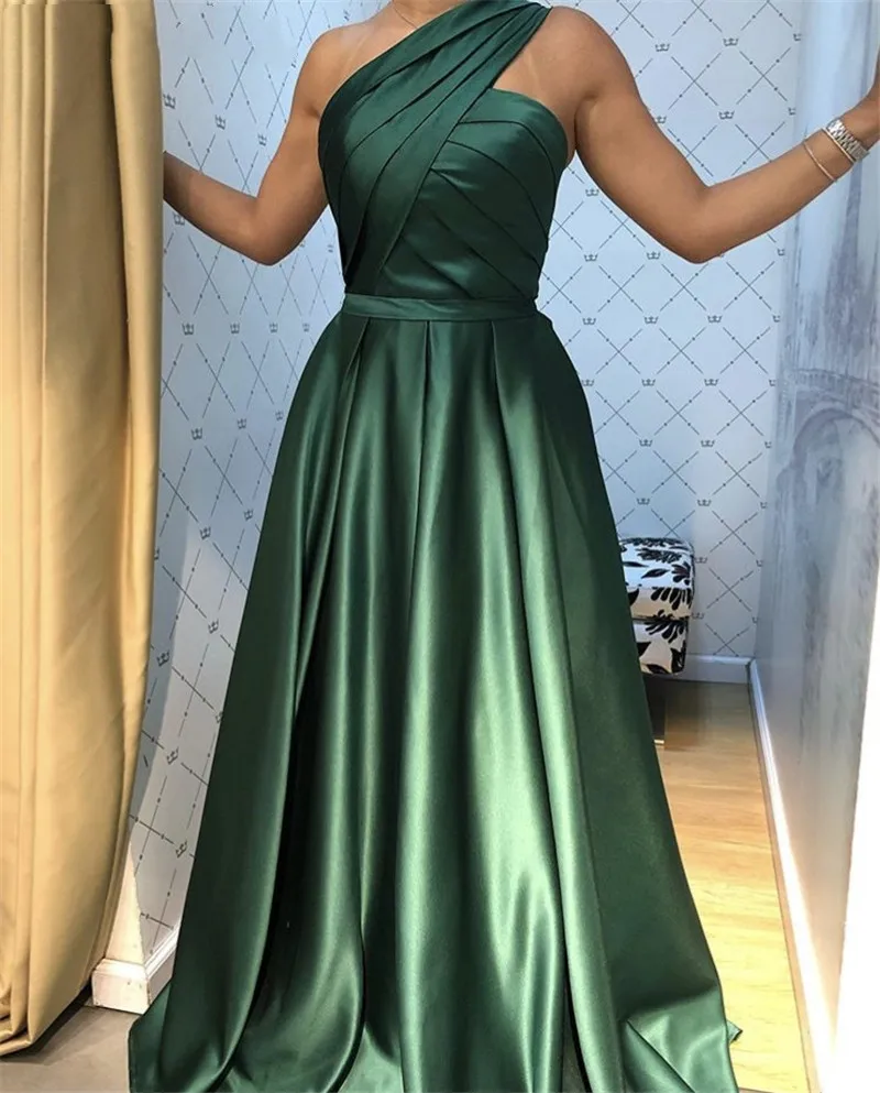 Женское атласное платье с одним открытым плечом, зеленое платье-трапеция со шлейфом для выпускного вечера