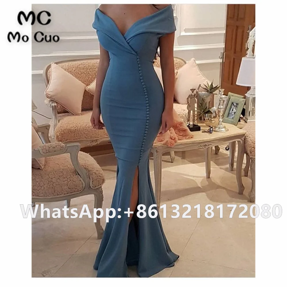 2021 пыльное синее вечернее платье с открытыми плечами, длинное платье на пуговицах с Боковым Разрезом, эластичное атласное женское вечернее платье