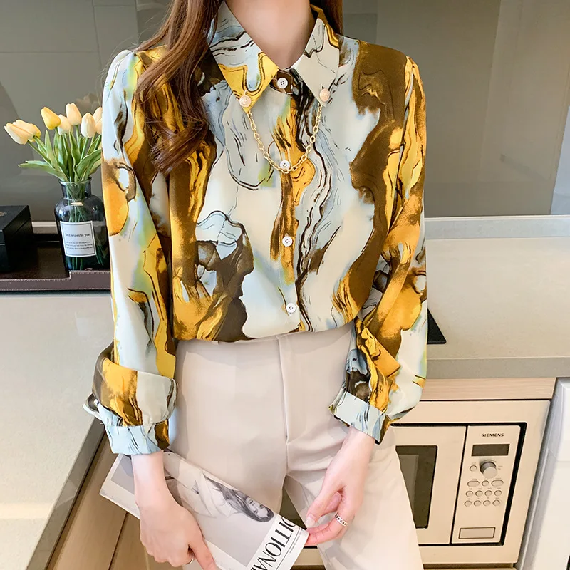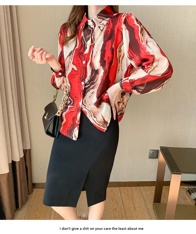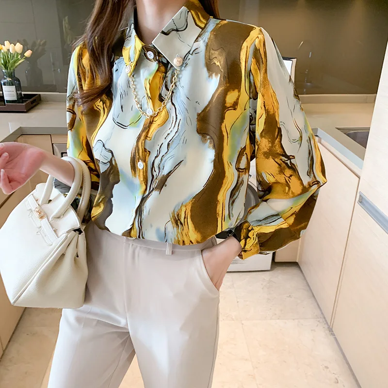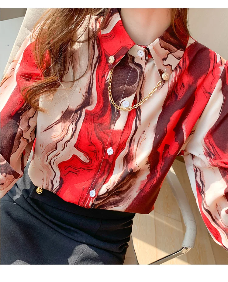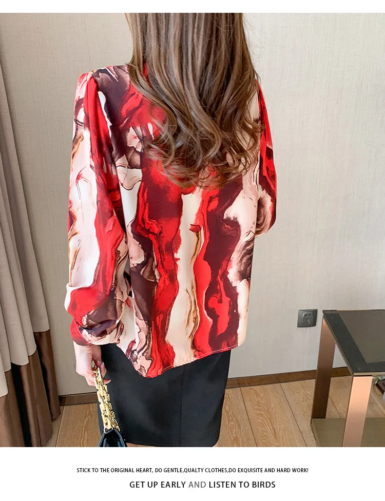 2021 Новая модная Темпераментная Женская рубашка с принтом корейский шифоновый Свободный Топ с рукавами-фонариками для девушек B019