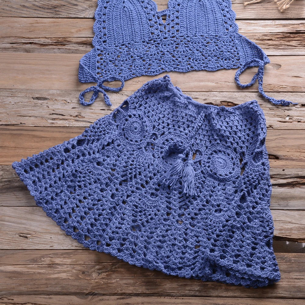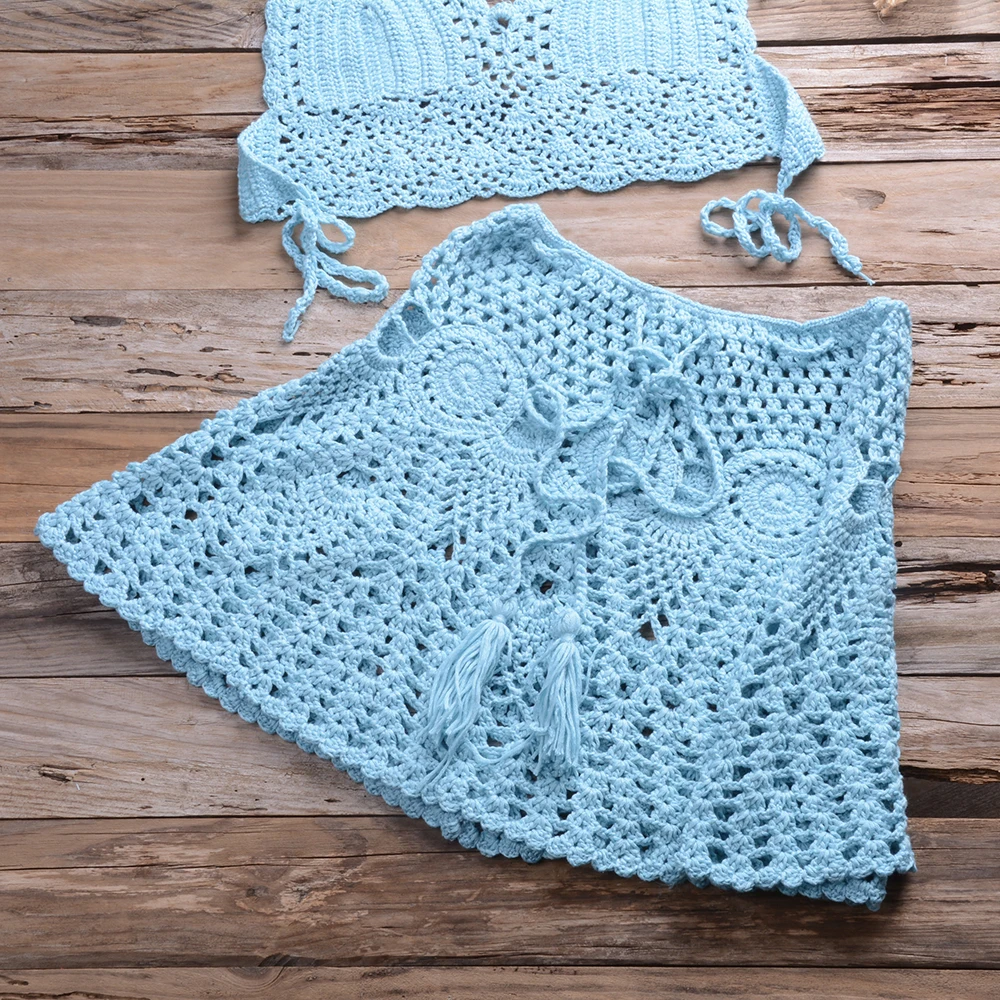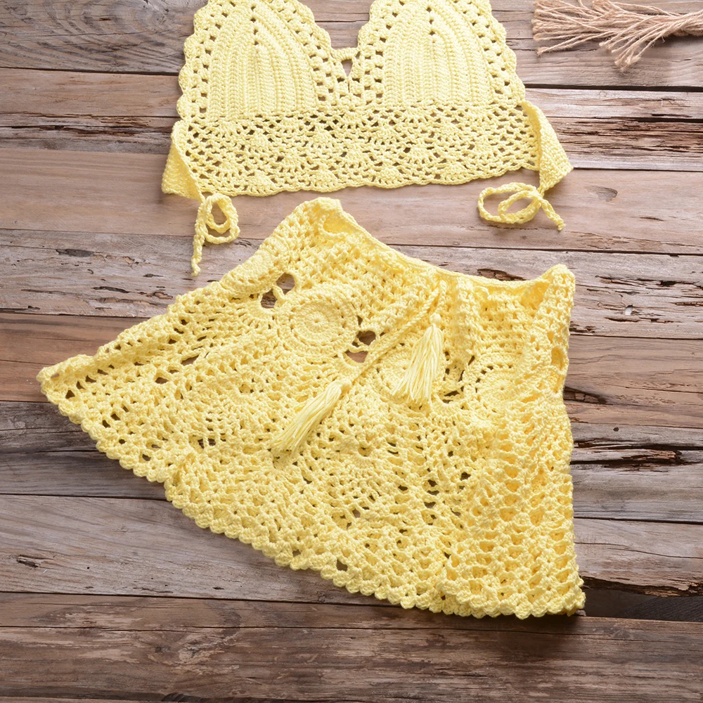 Женский вязаный комплект бикини, из двух частей, накидка, юбка для плавания, пляжная одежда для купания