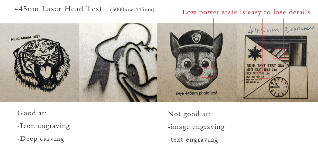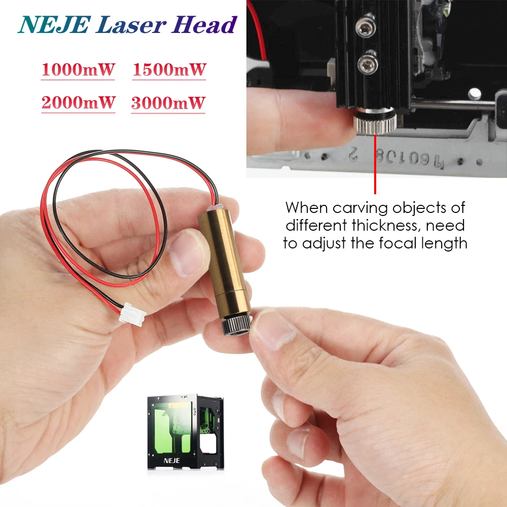 Если вам нужно вырезать портрет, мы рекомендуем использовать лазерную головку neje 1000 нм (1500 МВт, 2000 мВт или МВт), если вы используете ее только для гравировки текста или логотипа, мы рекомендуем использовать лазерную головку neje 3000 Нм (мВт), потому что она быстрее и гравирует глубже
