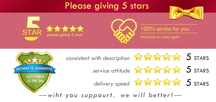 Если вам нравятся наши товары, пожалуйста, дайте нам положительные отзывы. Если вы не очень удовлетворены, пожалуйста, сначала свяжитесь с нами и сообщите нам о недостатке, чтобы мы могли улучшить наш сервис и качество продукцииНепрерывно.