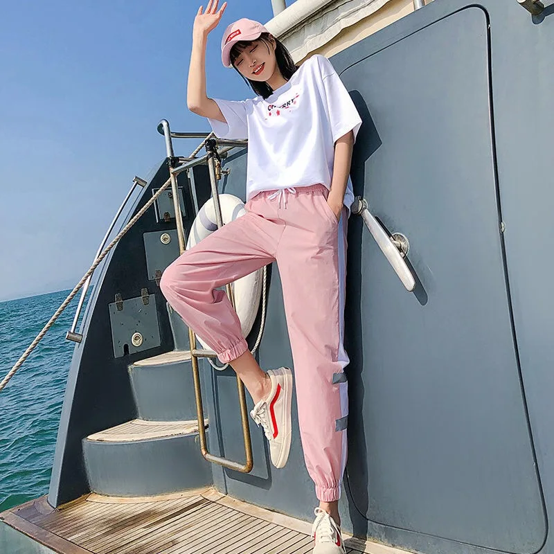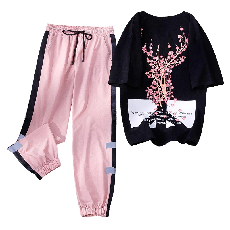 Женский спортивный костюм из двух предметов, Повседневная футболка с цветочным принтом и штаны с эластичным поясом, лето 2021