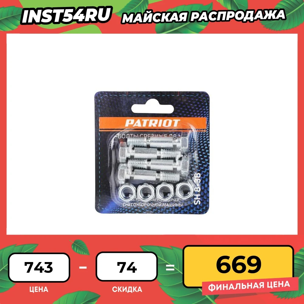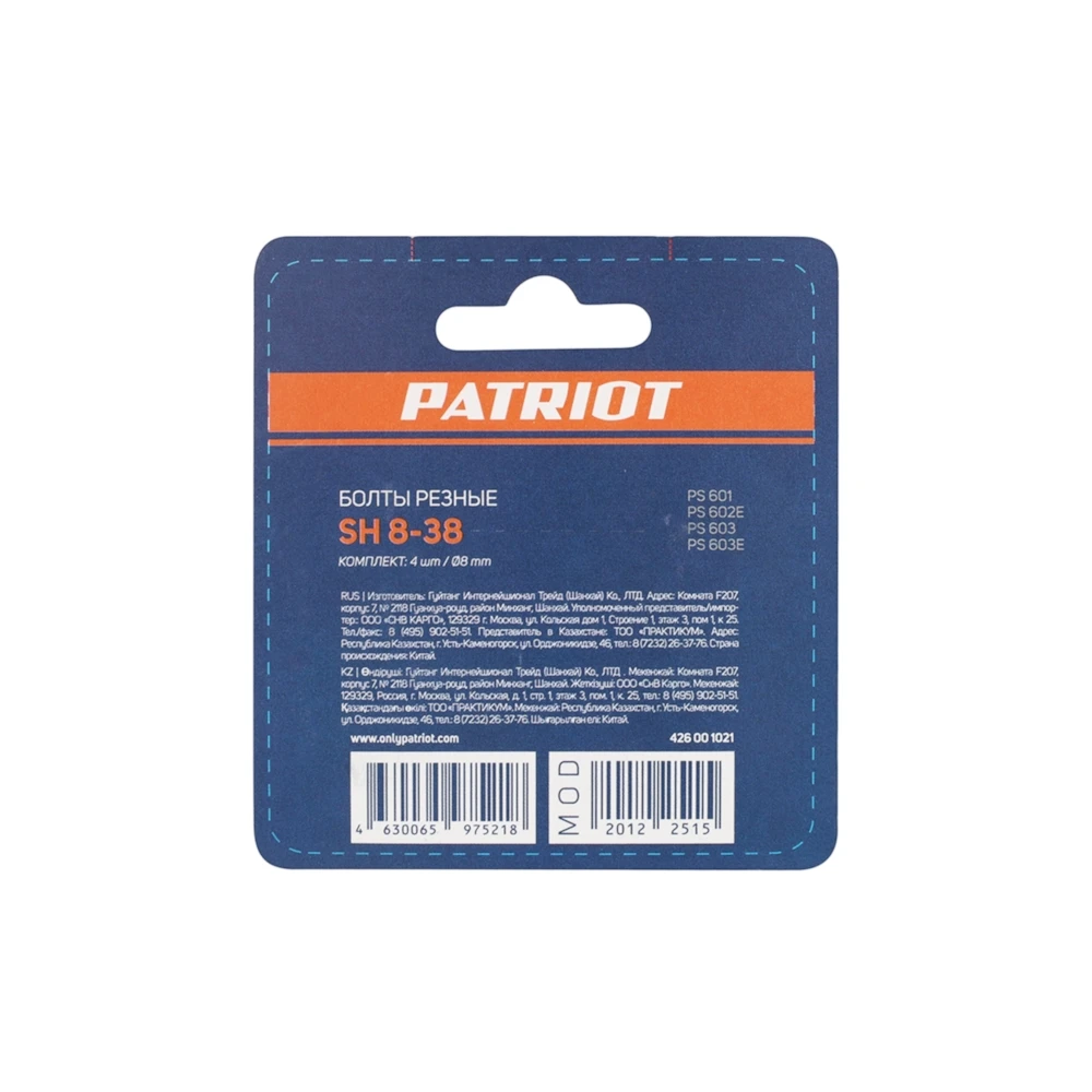 Болты срезные PATRIOT SH 8-38 диаметр 8 мм, для установки на шнек снегоуборочной машины(комплект 4шт) 426001021