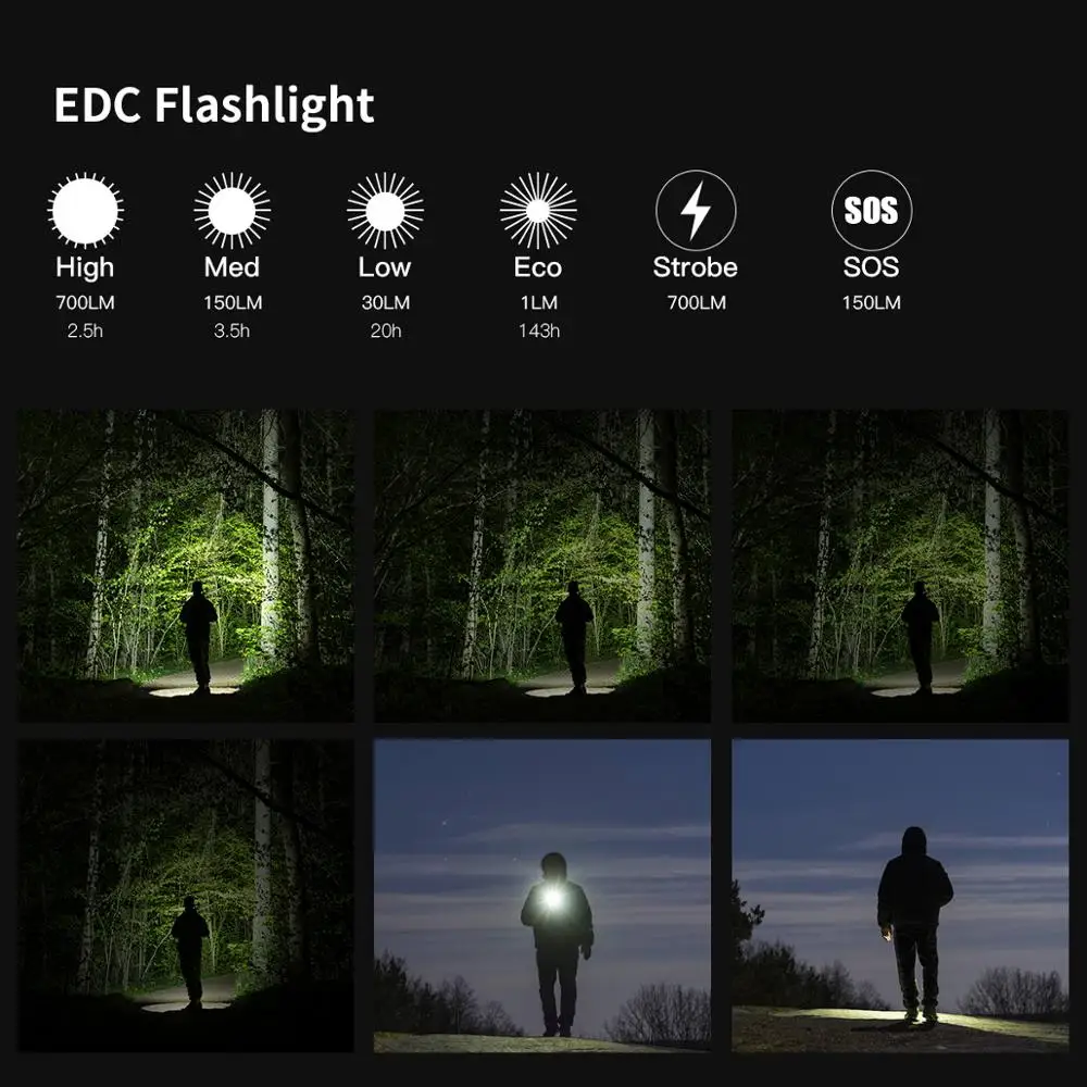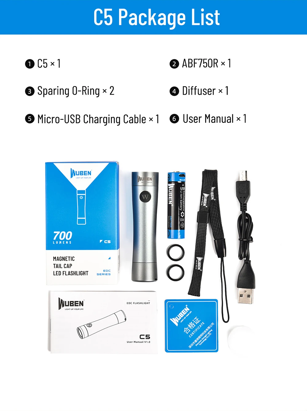 【Мини светодиодный фонарик, легко переносимый 】 фонарик WUBEN C5 EDC с батареей весит 57 граммов, легкий, как яйцо, отлично подходит для ежедневного или наружного использования. Он использует OSRAM P9 светодиодный и Жесткий анодированный 6061 авиационный алюминиевый сплав, максимальный выход до 700 люменов, максимальное расстояние луча до 126 метров. 【 6 режимов светодиодный фонарик и удобная мощность 】 4 основных режима (высокий, средний, низкий, лунный) и 2 режима вспышки (стробоскоп, SOS). Боковой переключатель, один переключатель, все функции, легко и удобно. Он питается от 3,7 V USB Перезаряжаемые 14500 Батарея (все указанные аккумуляторы входят в комплект поставки) или 1,5 V AA Батарея. Он может длиться около 70 часов дольше в режиме Луны. Подходит для домашнего использования, ухода за садом, прогулок с животными, Походов, Кемпинга и т. д. 【Мягкий и удобный светильник, светильник-вспышка с кремниевым диффузором 】светильник-вспышка WUBEN C5 поставляется с силиконовым диффузором, который maks светильник-мягкий и удобный прожектор-светильник. Кроме того, магнитный задний колпачок этого мини-фонарь позволяет его прикрепить к Железному материалу, чтобы освободить руки. Водонепроницаемость IP65. Фонарь изготовлен из алюминиевого сплава, имеет магнитную заднюю крышку, прочный, этот светодиодный фонарь имеет защиту от пыли и воды ip65. Упаковка включает: Фонарик 1xc5 1x литий-ионный аккумулятор 14500 1x USB кабель для зарядки 1x Ремешок 2x уплотнительное кольцо 1x диффузор 1x Руководство пользователя