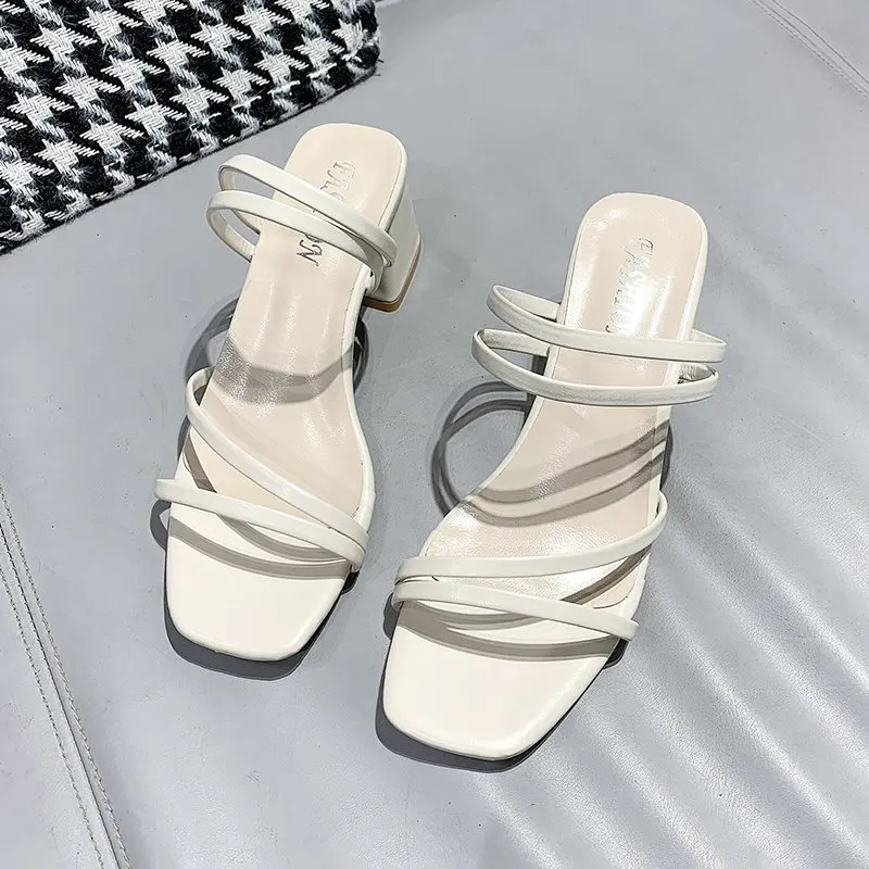 2021 новые женские тапочки с квадратным носом хаки сандалии, летняя обувь для женщин; Цвет черный, шлепанцы без задника с открытыми пальцами; Женские туфли на высоком каблуке бежевого цвета