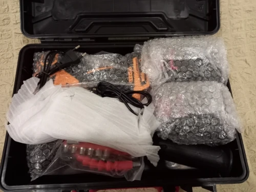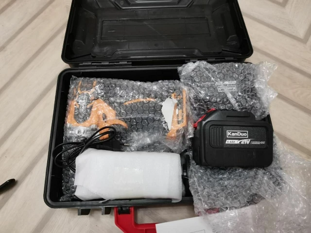 коробка немного памята, но кейс не повреждён содержимое кейса согласно описанию, шуруповерт работает, два аккумулятора заряженны, всё работает ровно без нареканий. Как встанет лёд буду пробовать, потом напишу дополнение.