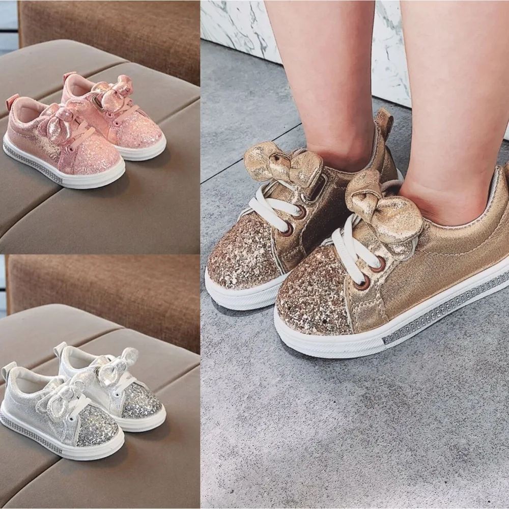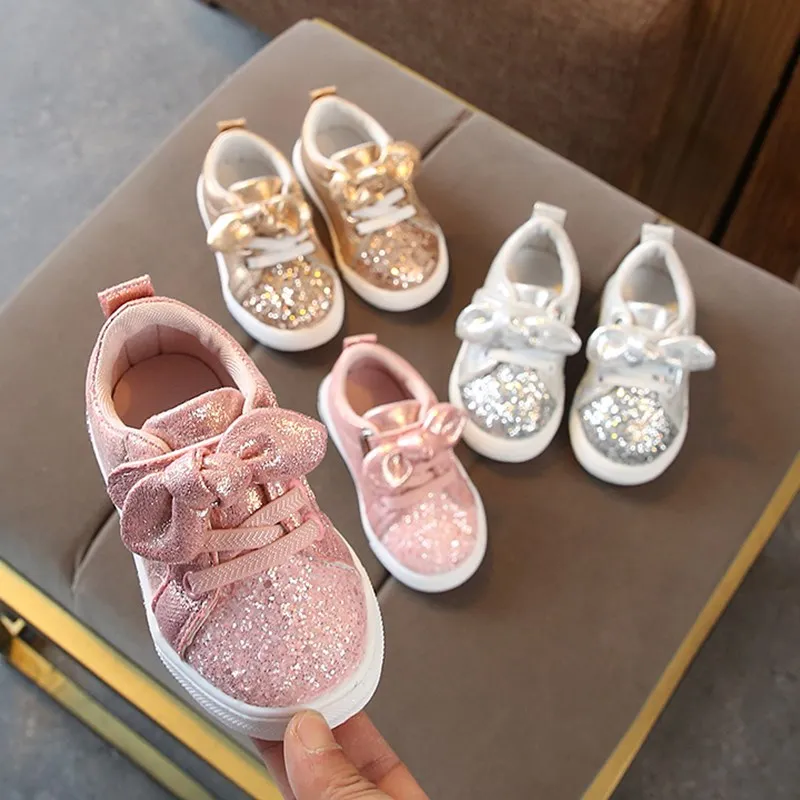 Кроссовки для девочек с бантом и блестками, повседневная нескользящая обувь под платье, розовые, для начинающих ходить детей