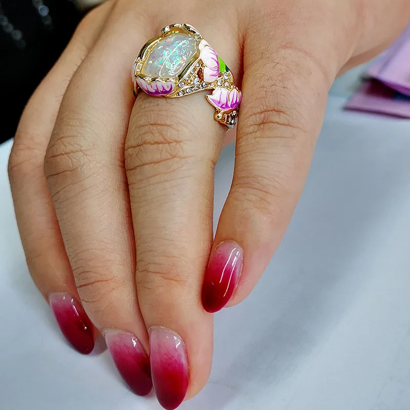 Красочные огненный опал кольца с лотосом для Для женщин цветок арт-деко циркония вымощенный золотистого цвета с цветочным рисунком и кольцо лаванды эмаль овальной формы