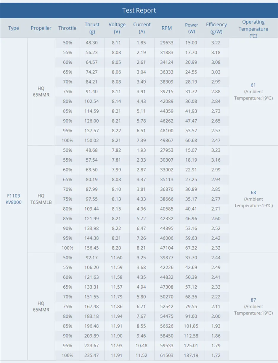 Ток холостого хода @ 10V: 0.58A @ 8000KV ; 0.65A @ 11000KV