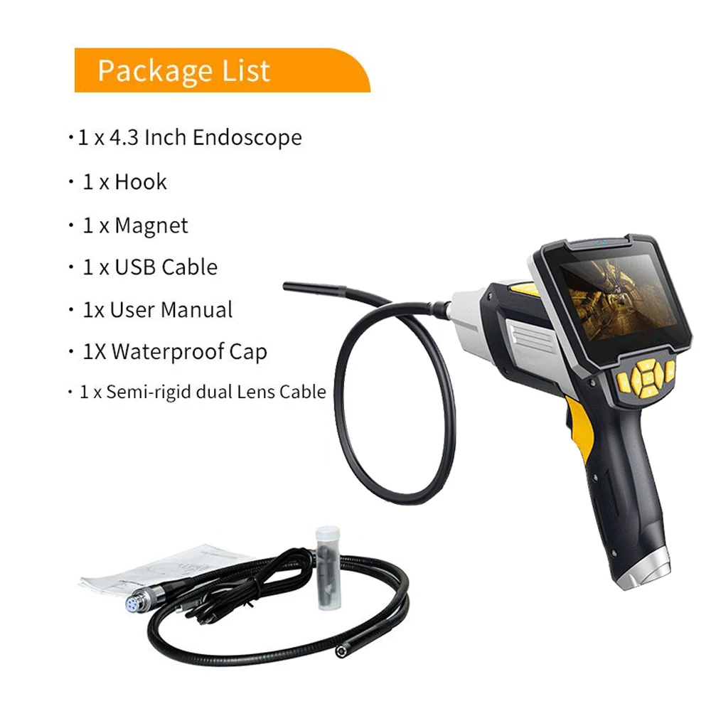 Этот эндоскоп с двумя линзами и экраном-новейшая конструкция с двумя камерами на этом эндоскопе. Просто Управляйте соответствующей кнопкой, вы можете открыть боковую камеру, чтобы увидеть то, что вы хотите видеть. Попрощайтесь, чтобы переместить кабель, если вы хотите получить вид сбоку.