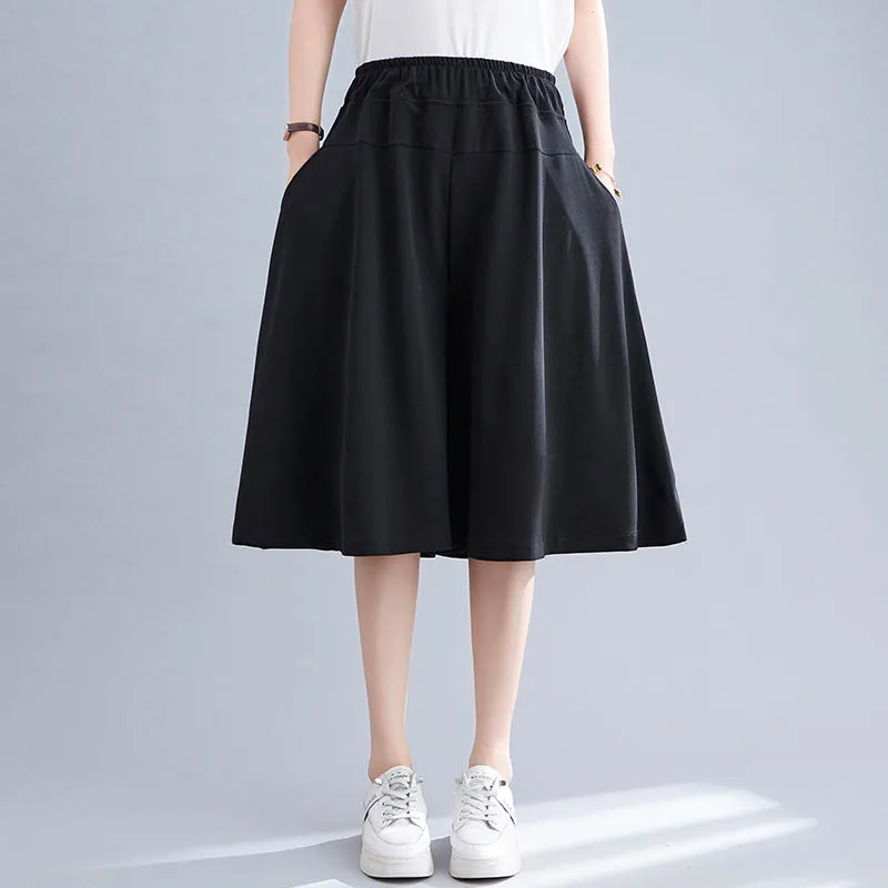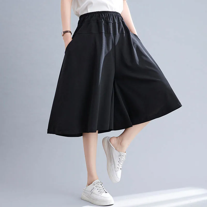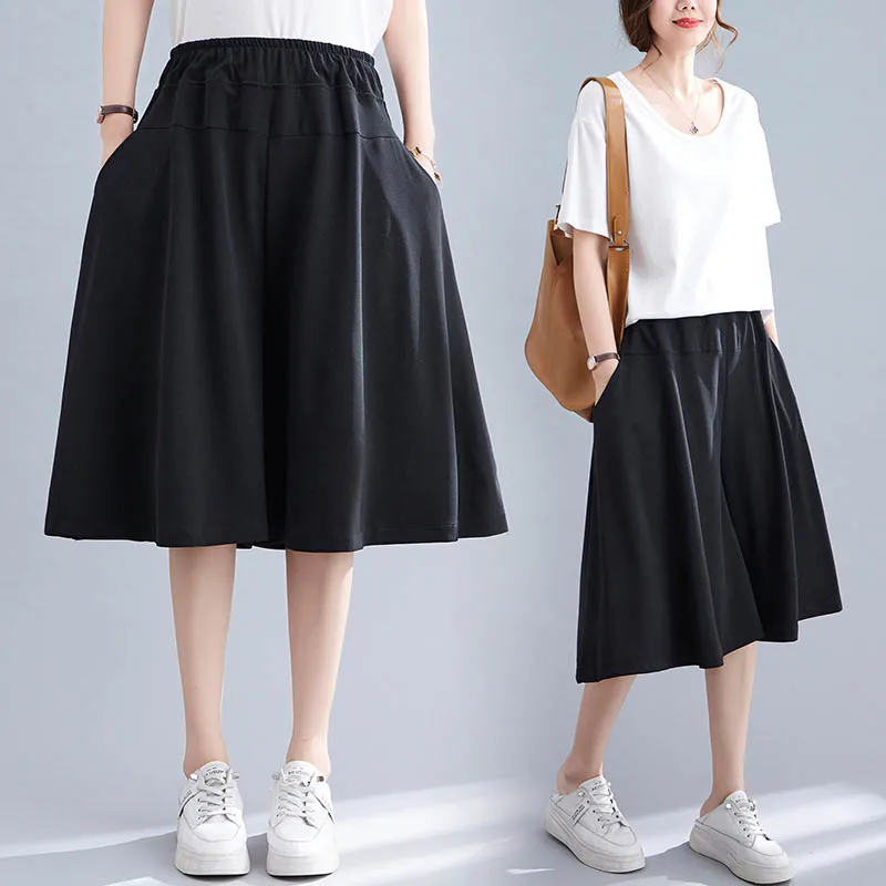 Женские широкие шорты-кюлоты с поясом на резинке, свободные черные шорты с пятью широкими штанинами, с завышенной талией, 140 кг, лето размера плюс