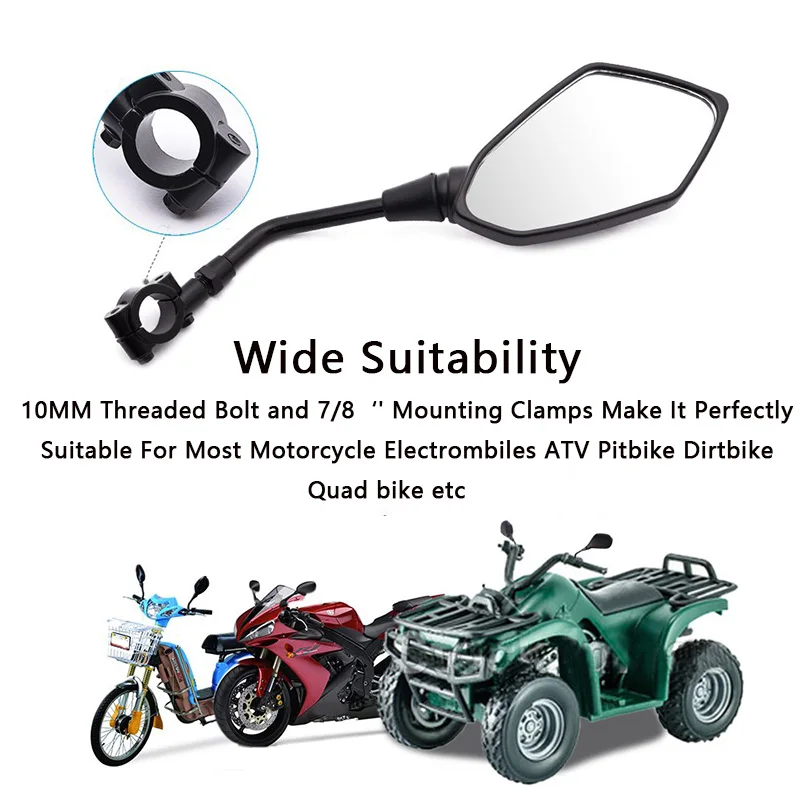 ★【Фитинг】 С резьбовым болтом 10 мм по часовой стрелке и зажимом для крепления на руль 7/8 ", совместим с большинством мотоциклов, уличных велосипедов, квадроциклов, грязевых велосипедов, квадроциклов питбайка, велосипедов и скутеров, таких как Aprilia, BMW, Buell, Ducati, Honda, Indian, Kawasaki, Suzuki, Triumph и Yamaha и многое другое.