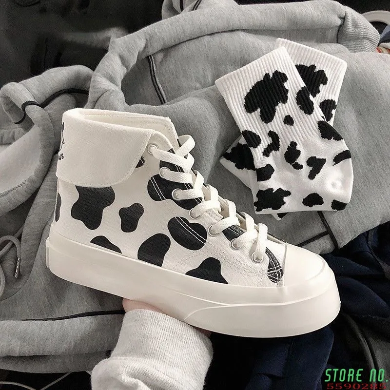 Кроссовки женские с коровьим принтом, милые модные повседневные ботинки на платформе, на шнуровке, обувь для студентов, весна 2021