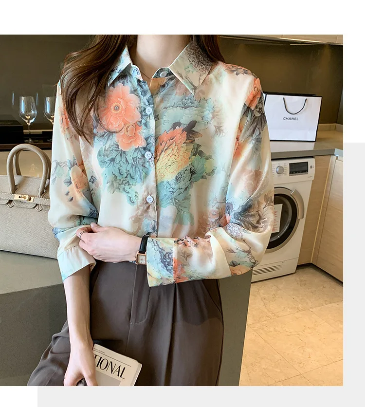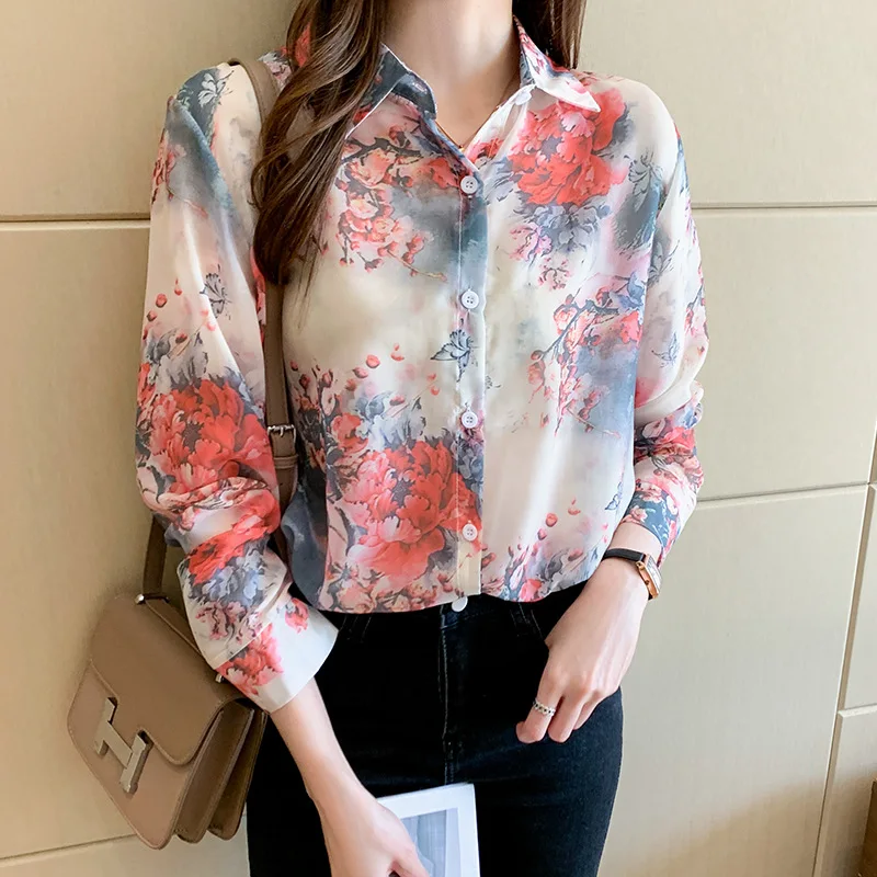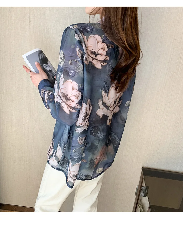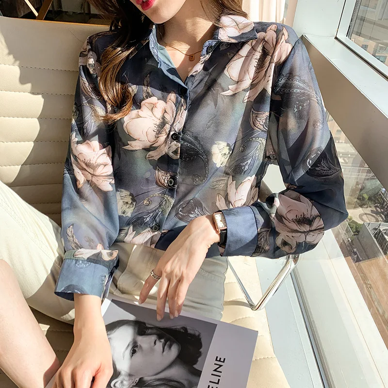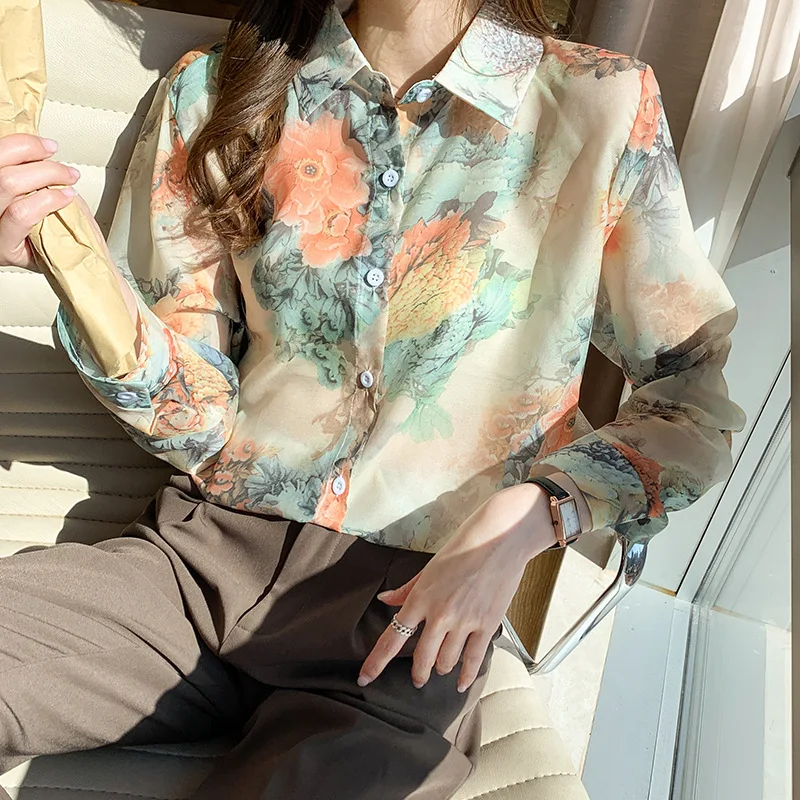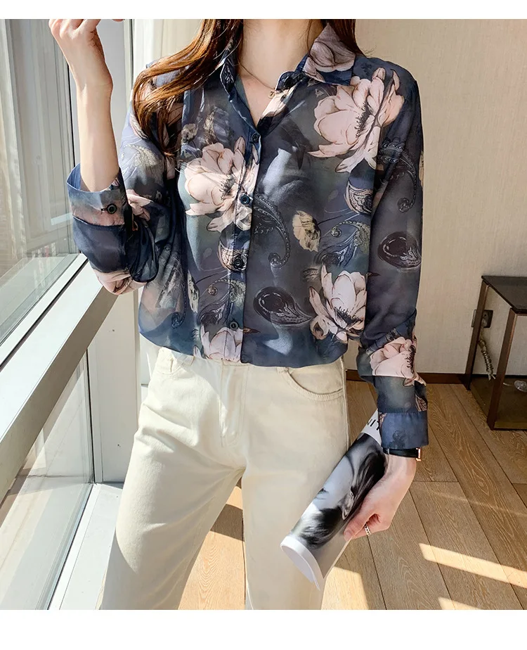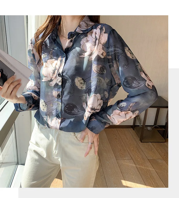 Новинка 2021, женская шифоновая рубашка с цветочным принтом и длинным рукавом, свободная Корейская рубашка в стиле ретро Гонконг, Солнцезащитная рубашка B026