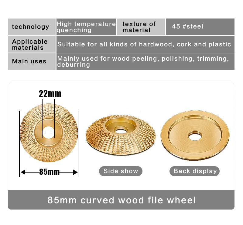 Область применения Следует использовать только на неметаллических или неметаллических материалах, подходящих для дерева и других материалов. Подходит для быстрого удаления и формирования, особенно для выпуклых и вогнутых зон. Экономия усилий Обеспечивает быстрое удаление материала, экономя ваше время и усилия, подходит для изогнутой работы. Подходит для углового шлифовального станка, и его легко использовать. Прочный Карбид вольфрама покрытия состоят из сотни чрезвычайно острых зубов, которые быстро удаляют запас и превосходят сотни наждачных бумажных колодок.