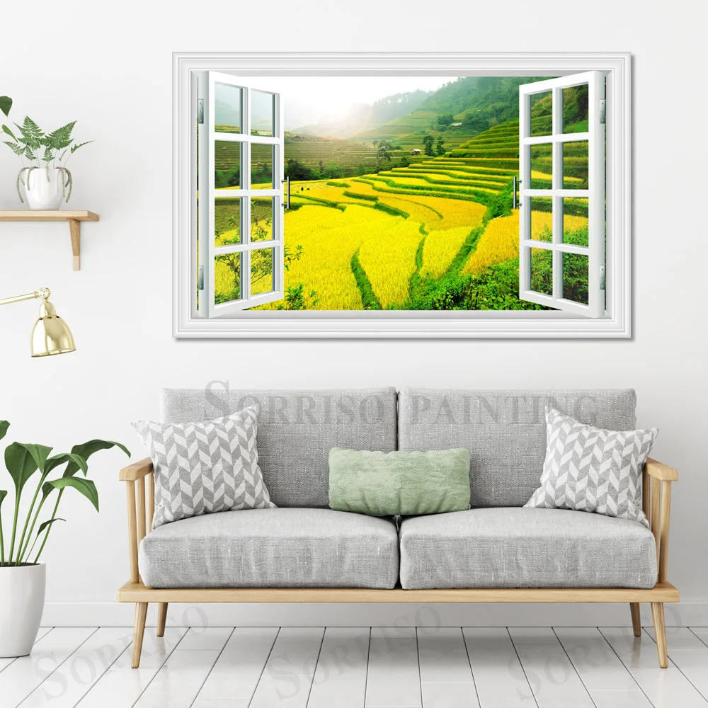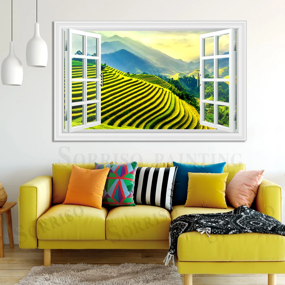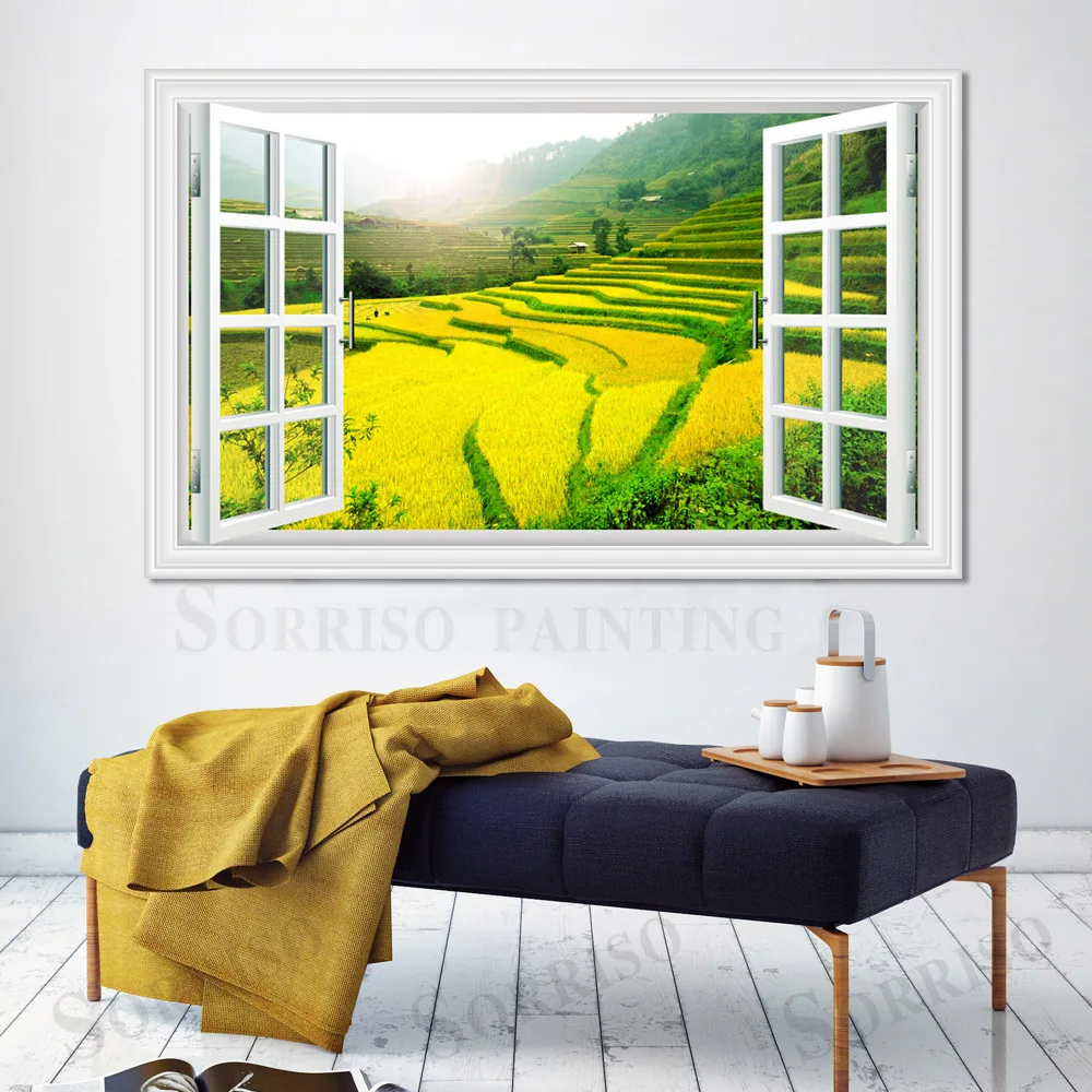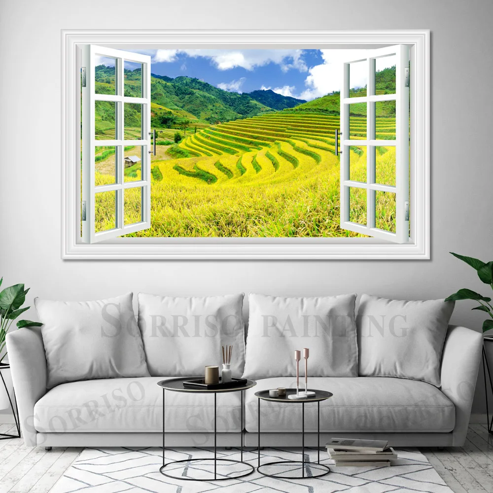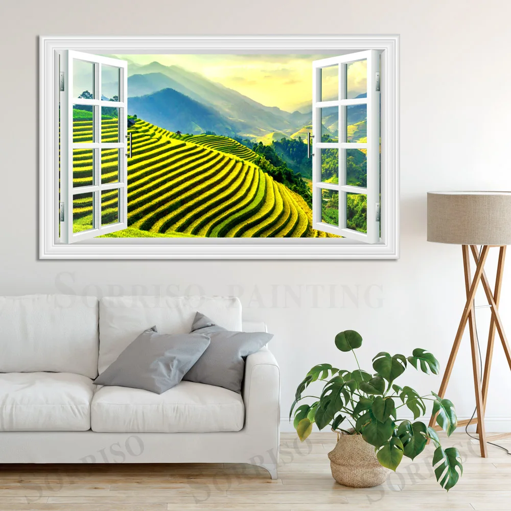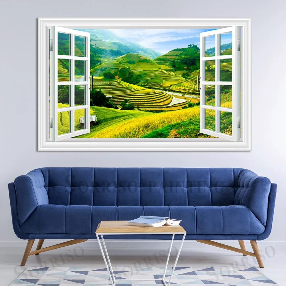Зеленая терраса, пейзаж сельской местности, имитация окна, Настенный дизайн, Художественная Картина на холсте, плакаты, картины, принты, Декор для дома, гостиной
